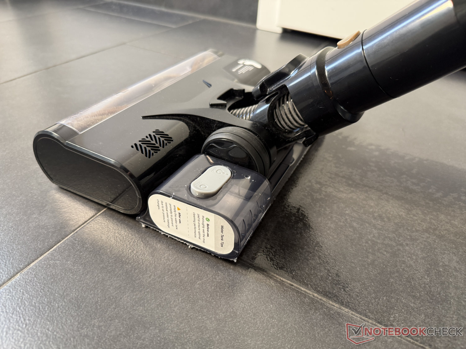 De grote vloerkop van de P20 OnePass wordt vervolgens op het dweilhulpstuk geplaatst. Het opzetstuk zit achter de vloerrol, zodat u in één keer kunt stofzuigen en dweilen, maar het blokkeert ook de rollen. Bovendien mag het apparaat niet worden opgetild, omdat de watertank niet op de stofzuiger zelf vastzit.