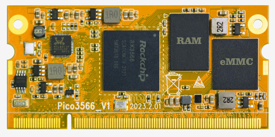 De PICO3566 is een systeem-op-module (SoM) ontworpen als alternatief voor de Raspberry Pi CM3+. De SoM is ontwikkeld door Boardcon Embedded Design en ondersteunt Android 12 en Debian 11, waarvan de volledige driver-details te vinden zijn op de productlijst van de PICO3566. Zoals de naam al suggereert, vertrouwt de PICO3566 op de Rockchip RK3566, een SoC gebaseerd op 22 nm nodes die beschikt over vier ARM Cortex-A53 CPU-kernen geklokt op 1,2 GHz en een Mali-G52 MP2 GPU.