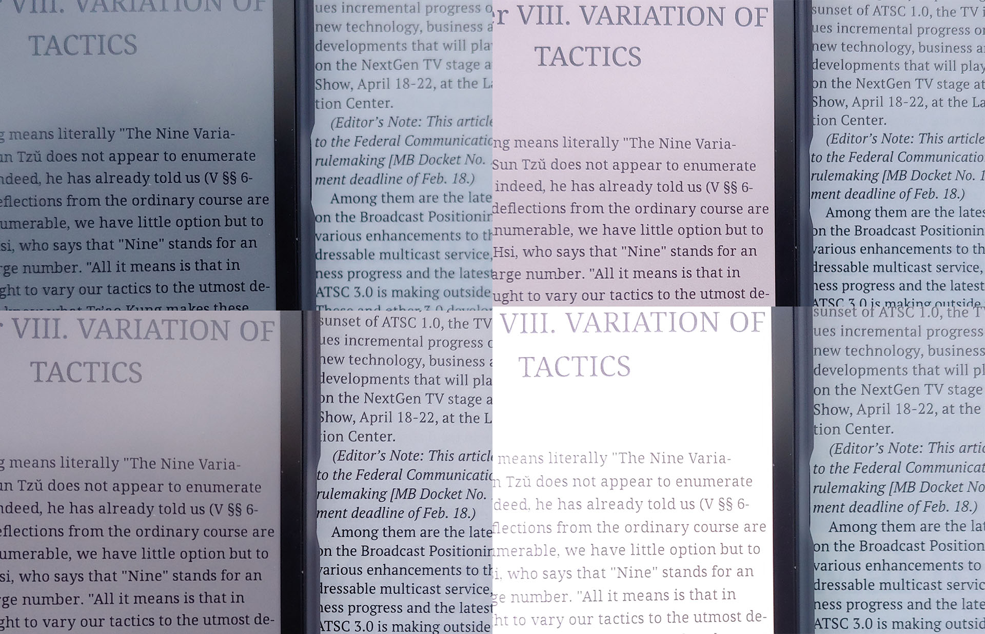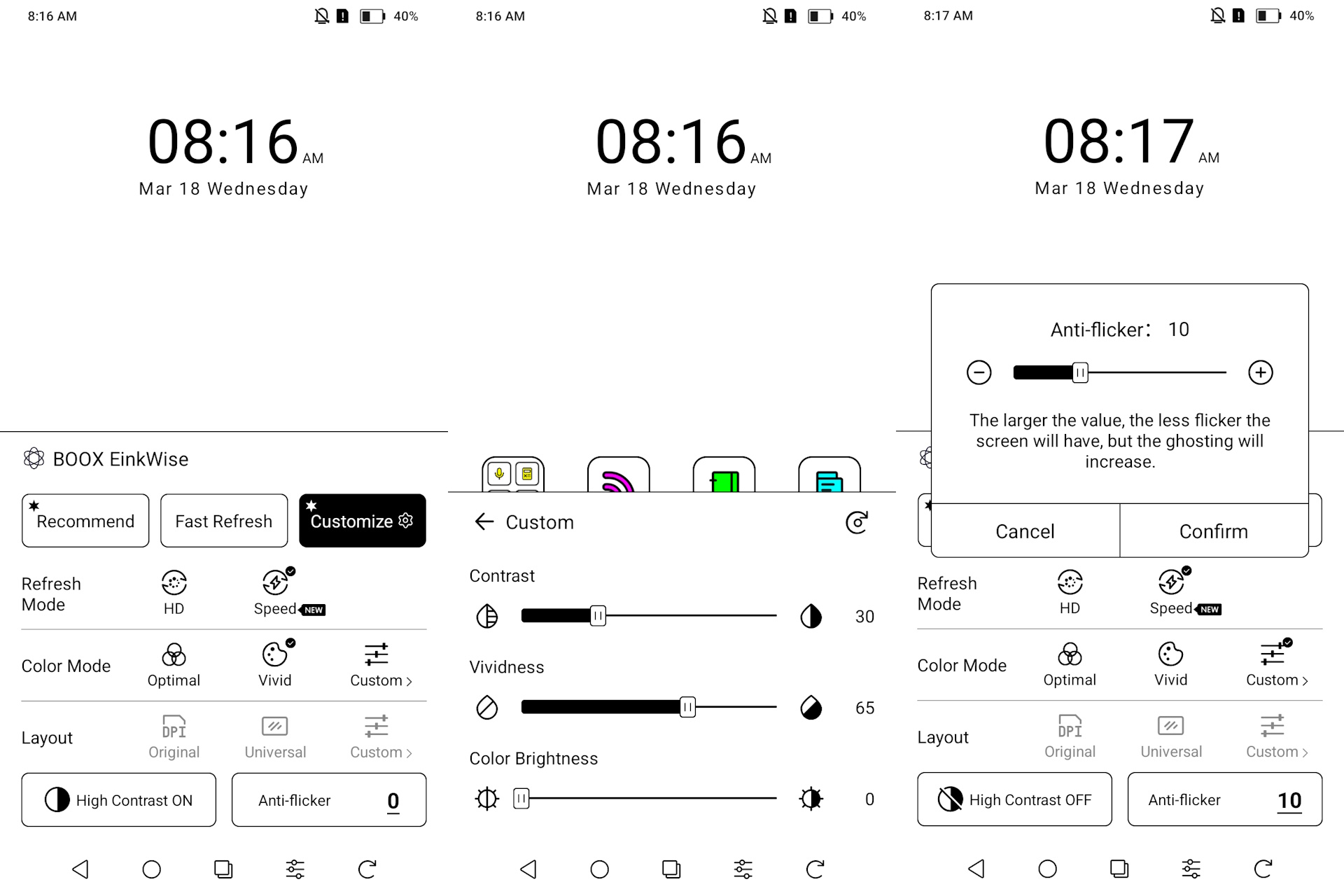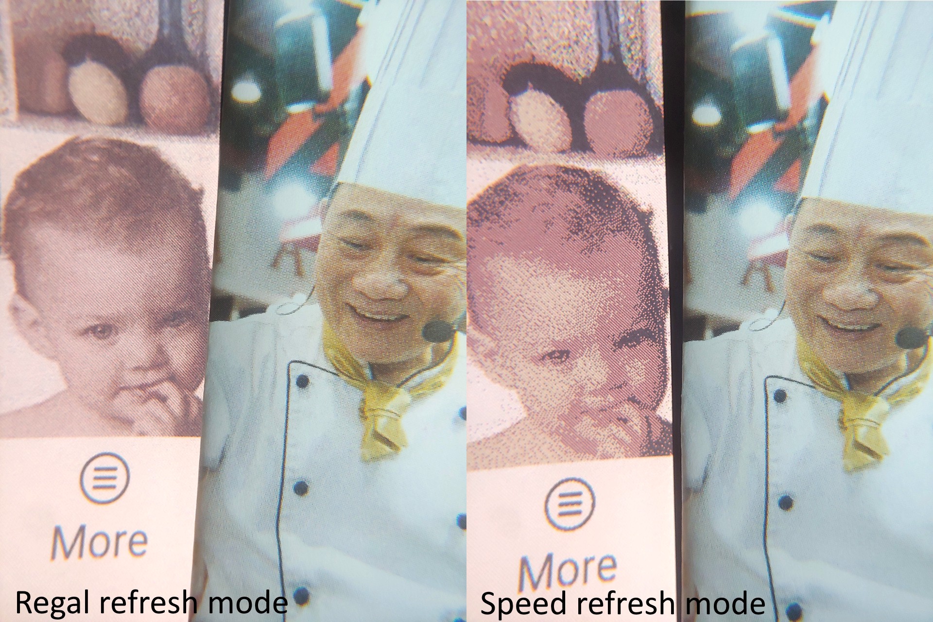 De modus Snel verversen maakt snel scrollen mogelijk, maar verlaagt de beeldkwaliteit, terwijl de modi Regal en HD de helderheid verbeteren ten koste van langzamere interacties en af en toe omgekeerde flitsen. De kwaliteit benadert het niveau van een krant in de hogere modi en wordt merkbaar ruwer in de snelheidsmodus.