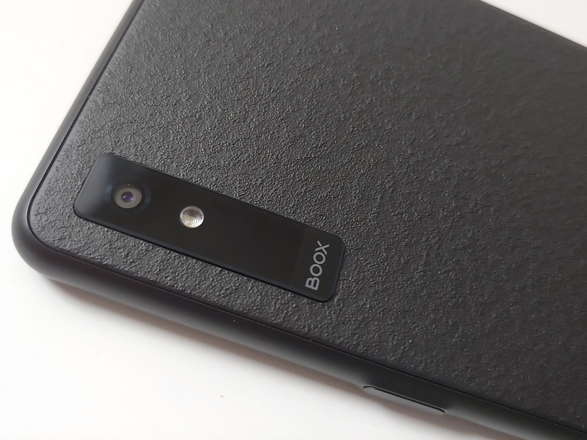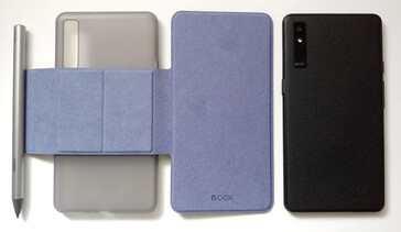 De e-reader werkt met een magnetische stylus en etui. De stylus wordt op de kale achterkant van de Boox of op het klepje van het etui bevestigd. De Boox past in het plastic hoesje en wordt vervolgens magnetisch bevestigd aan het klepje, dat ook vrij gemakkelijk losgeklopt kan worden.