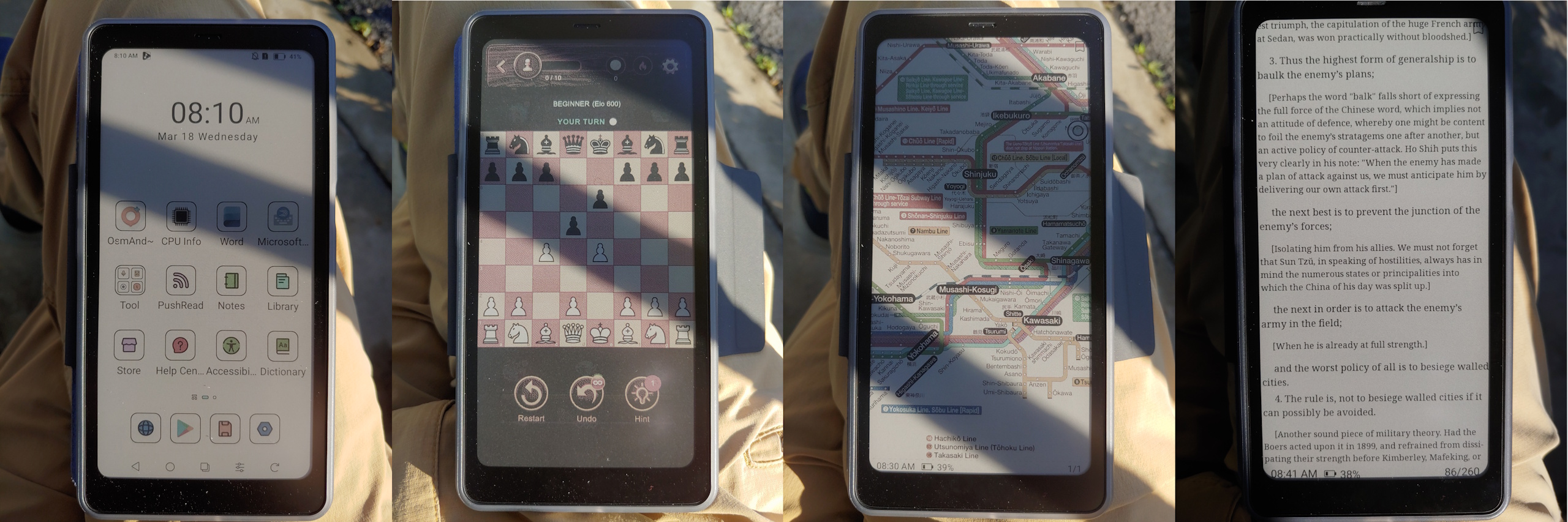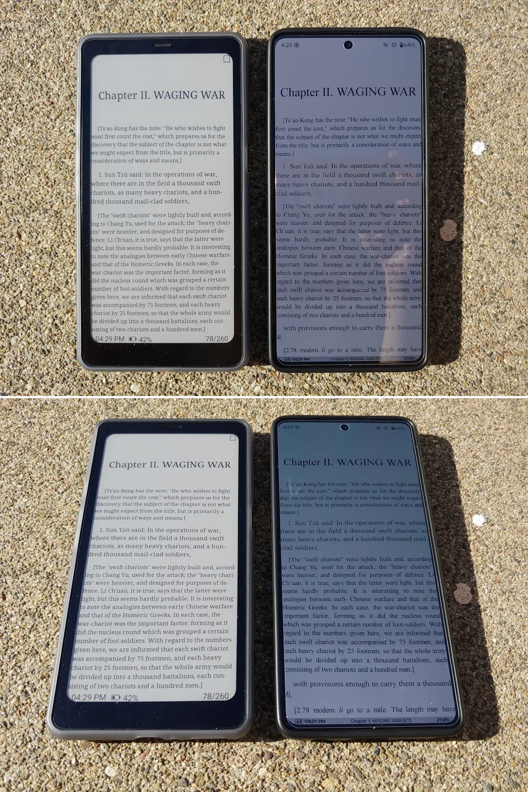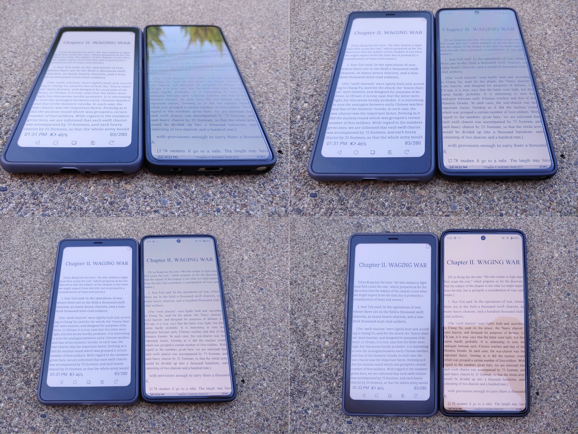 In de volle zon is het scherm van de Kaleido 3 veel beter afleesbaar dan dat van de Moto G Stylus 2024 OLED bij de maximale automatische helderheid van 1.200 nit. In de schaduw lijken beide even helder als de Moto is ingesteld op het handmatige maximum van ~550-nit. Het E Ink paneel blijft ook onder elke hoek leesbaar zonder de reflecties of kleurverschuivingen van de OLED.