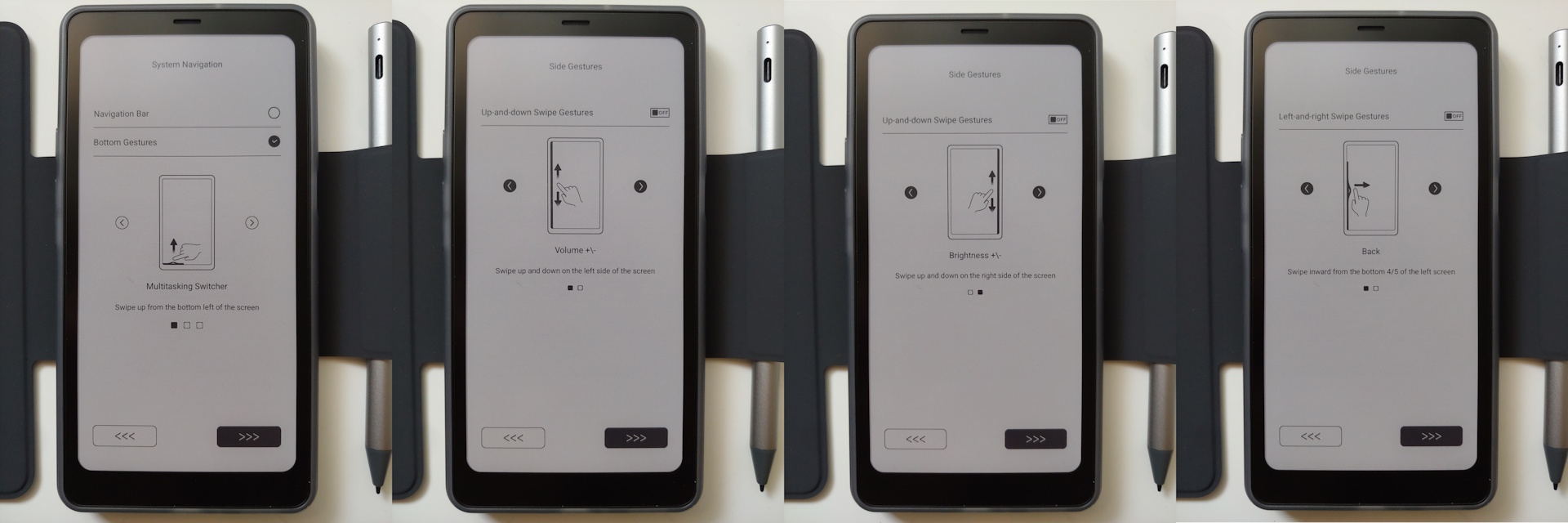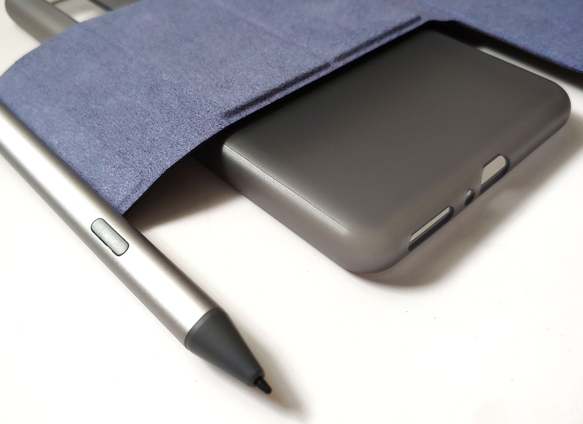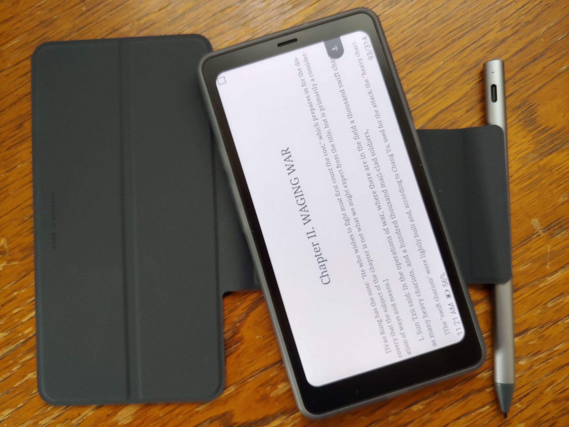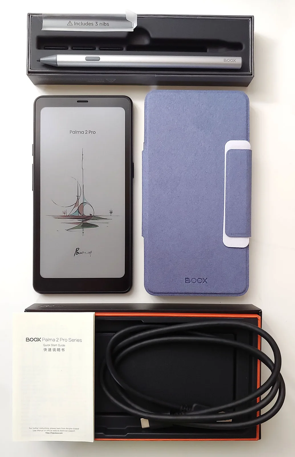 De e-reader werd geleverd met een USB-C kabel, een snelstartgids en een hulpmiddel om de SIM-kaart uit te werpen, plus een optionele magnetische hoes en een stylus met drie vervangende penpunten.