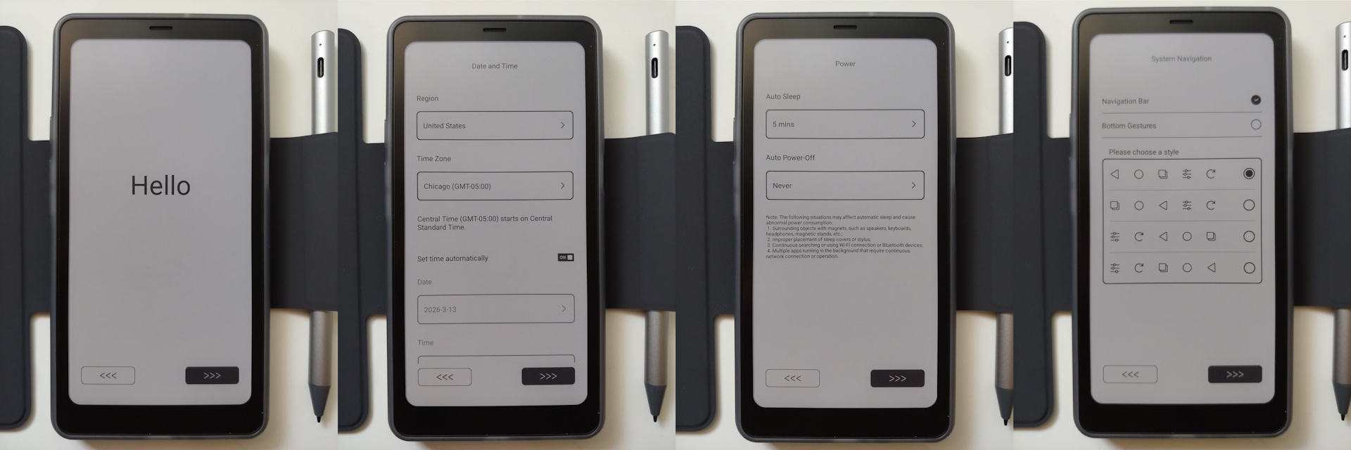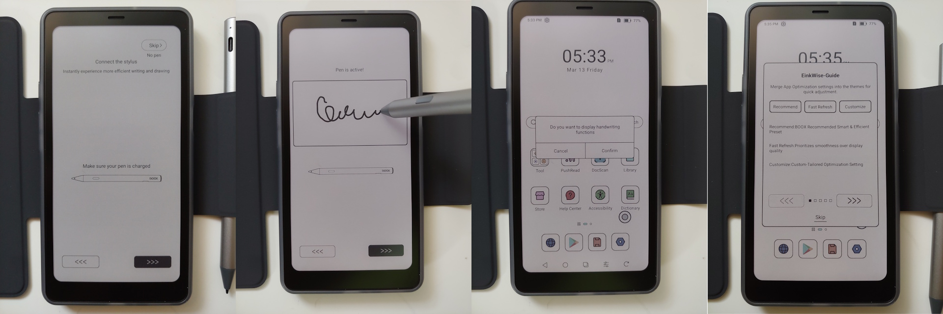 De installatie verliep snel, met prompts voor taal, tijd, GUI, peninstellingen en een EinkWise handleiding voordat u bij het beginscherm kwam. Een Google account is niet vereist, maar de AI Assistant vereist wel een Onyx account.