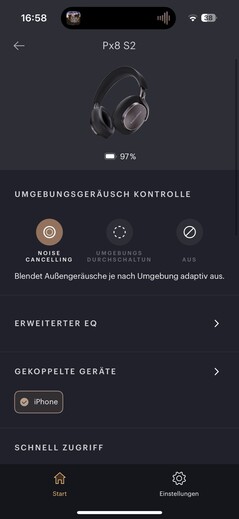 Aan de positieve kant presteert de actieve ruisonderdrukking uitstekend - tenminste voor laagfrequente geluiden. Het gezoem van automotoren of treinlawaai wordt bijna volledig onderdrukt als ANC is ingeschakeld. Hogere frequenties blijven echter grotendeels onaangetast, dus stemmen worden nauwelijks onderdrukt - net als bij de meeste concurrerende modellen. De transparantiemodus werkt daarentegen indrukwekkend goed: omgevingsgeluiden en stemmen komen duidelijk door en klinken bijna net zo natuurlijk als zonder de hoofdtelefoon.