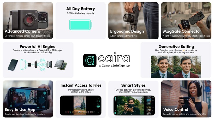 Caira wordt aangeprezen als een uitgebreide camera-upgrade voor de Apple iPhone. De camera wordt magnetisch aan de smartphone bevestigd via MagSafe en heeft een FourThirds sensor die volgens de fabrikant 400% groter is dan de sensor van de hoofdcamera van de Apple iPhone 17 Pro.