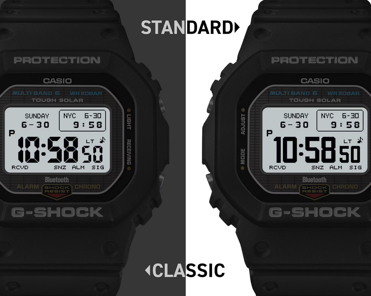 De productafbeeldingen tonen twee weergavemodi - Standaard en Klassiek - met het nieuwe MIP LCD-paneel. De vergelijking maakt de leesbaarheidsupgrade nog duidelijker, vooral door de manier waarop de cijfers contrast houden bij verschillende belichting. De productpagina's laten ook de originele voetafdruk van de 5600-serie zien. Beide horloges blijven dicht bij de klassieke DW-5600 vorm, maar verschuiven de internals naar een combinatie van Tough Solar, Bluetooth smartphone synchronisatie en Multiband 6 radio-ontvangst. Een expliciete opmerking op de pagina vermeldt dat het zonnepaneel een baksteenachtig patroon heeft, vergelijkbaar met vroege G-Shock ontwerpen.