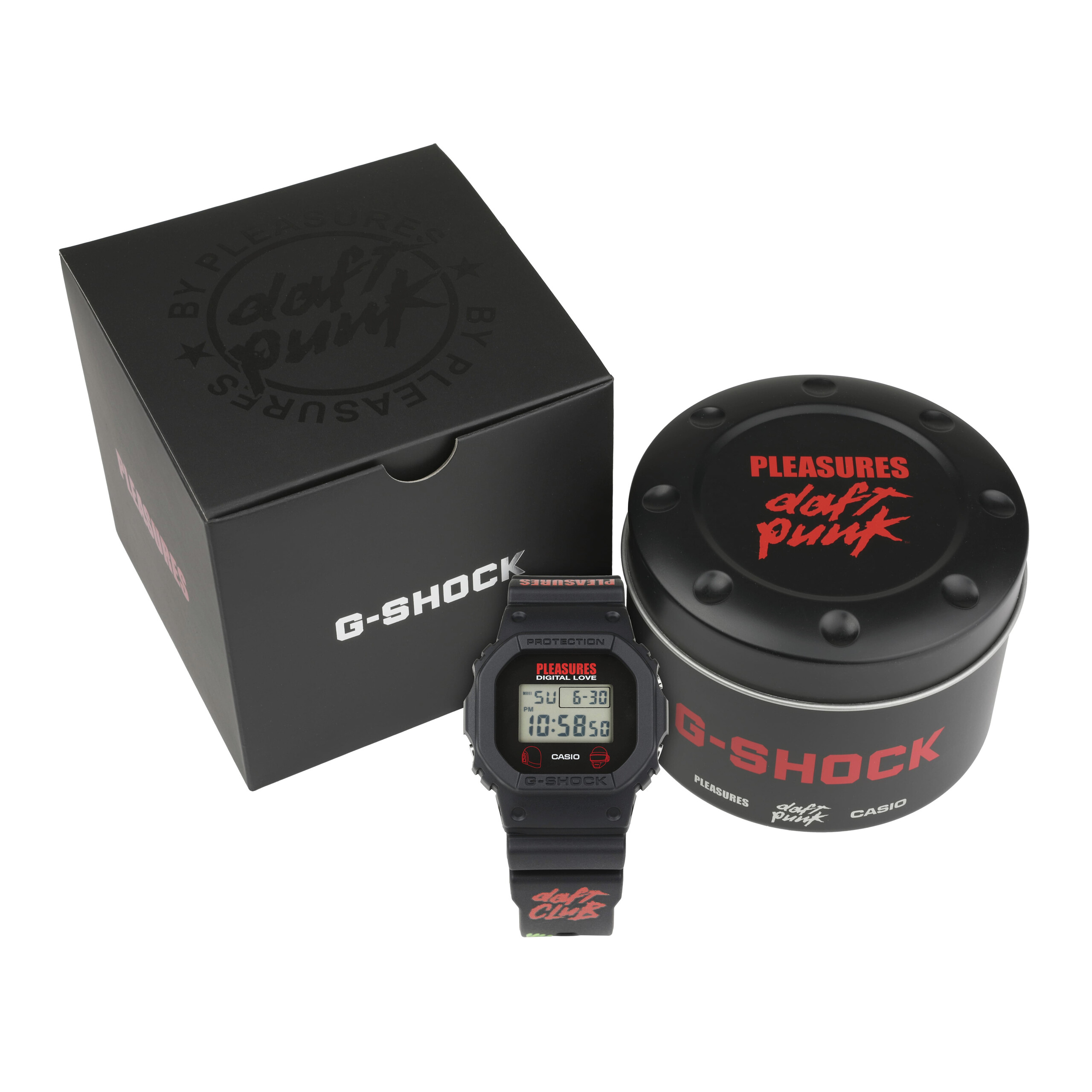 Dit drievoudige samenwerkingsmodel heeft de kenmerkende DW-5600 "vierkante" kast, met branding en afbeeldingen die geïnspireerd zijn door het iconische duo elektronische muziekproducenten Daft Punk, inclusief helm- en tekstmotieven op de band en band. De achtergrondverlichting toont ook Daft Punk-afbeeldingen. De verkoop zal beperkt zijn tot de Casio USA Online Store en de officiële winkel van Pleasures. De Japanse markt krijgt geen officiële release volgens Great G-Shock Worldmaar er wordt parallelle invoer verwacht. De prijzen zullen echter naar verwachting hoger zijn vanwege de beperkte beschikbaarheid.