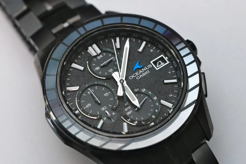 De wijzerplaat is ook interessanter op deze echte foto's. In plaats van er vlak en uniform uit te zien, heeft het oppervlak een gestructureerd, bijna steenachtig uiterlijk dat verschuift onder licht. De subwijzerplaten en markeringen springen er duidelijker uit en het omkaderde datumvenster om vier uur ziet er in het echt veel verfijnder uit. Het helderblauwe Oceanus golflogo valt op tegen de zwarte achtergrond - veel opvallender dan op de originele persafbeeldingen.