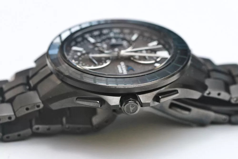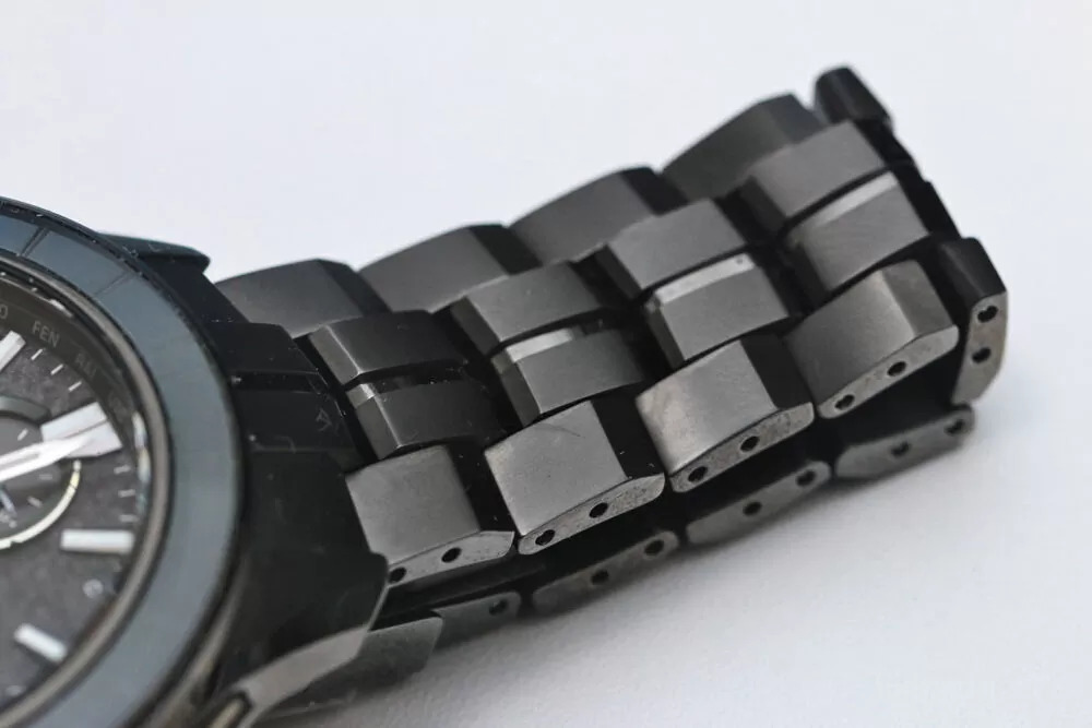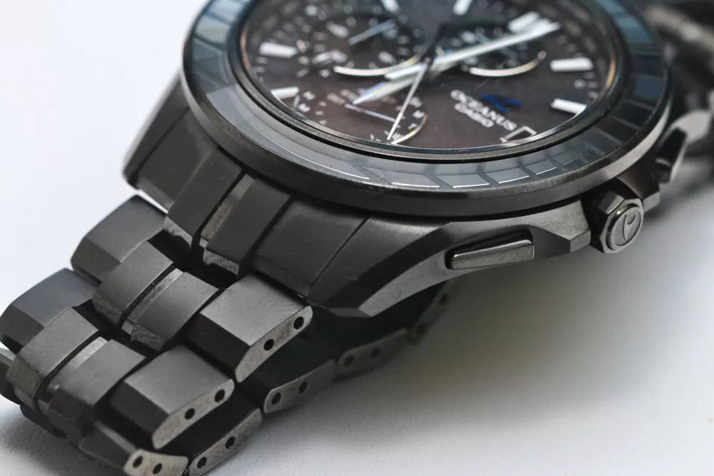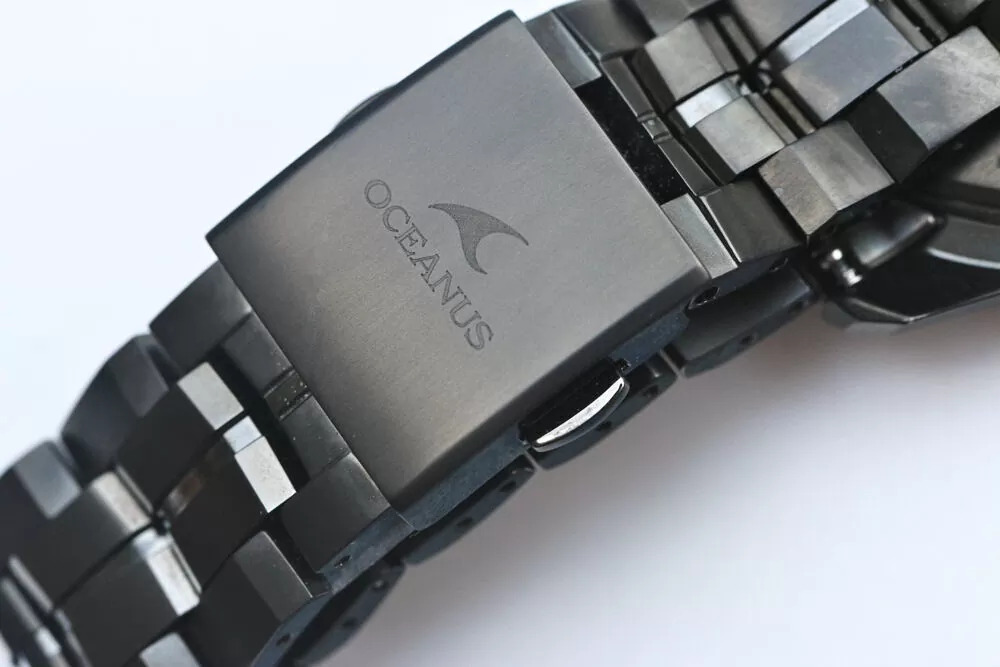 Het eerste dat opvalt, is de kast en armband. Het horloge lijkt volledig uit titanium gemaakt te zijn met een zwarte DLC afwerking, en de close-ups laten scherpere randen en complexere bewerkingen zien dan gewoonlijk. De schakels van de armband hebben duidelijk hoekige facetten, en het borstelen lijkt eerder diep dan lichtjes geverfd. De opname van de sluiting toont ook een mooi gegraveerd Oceanus-logo, met een matte textuur die het reflecterende polijstwerk eromheen aanvult.
