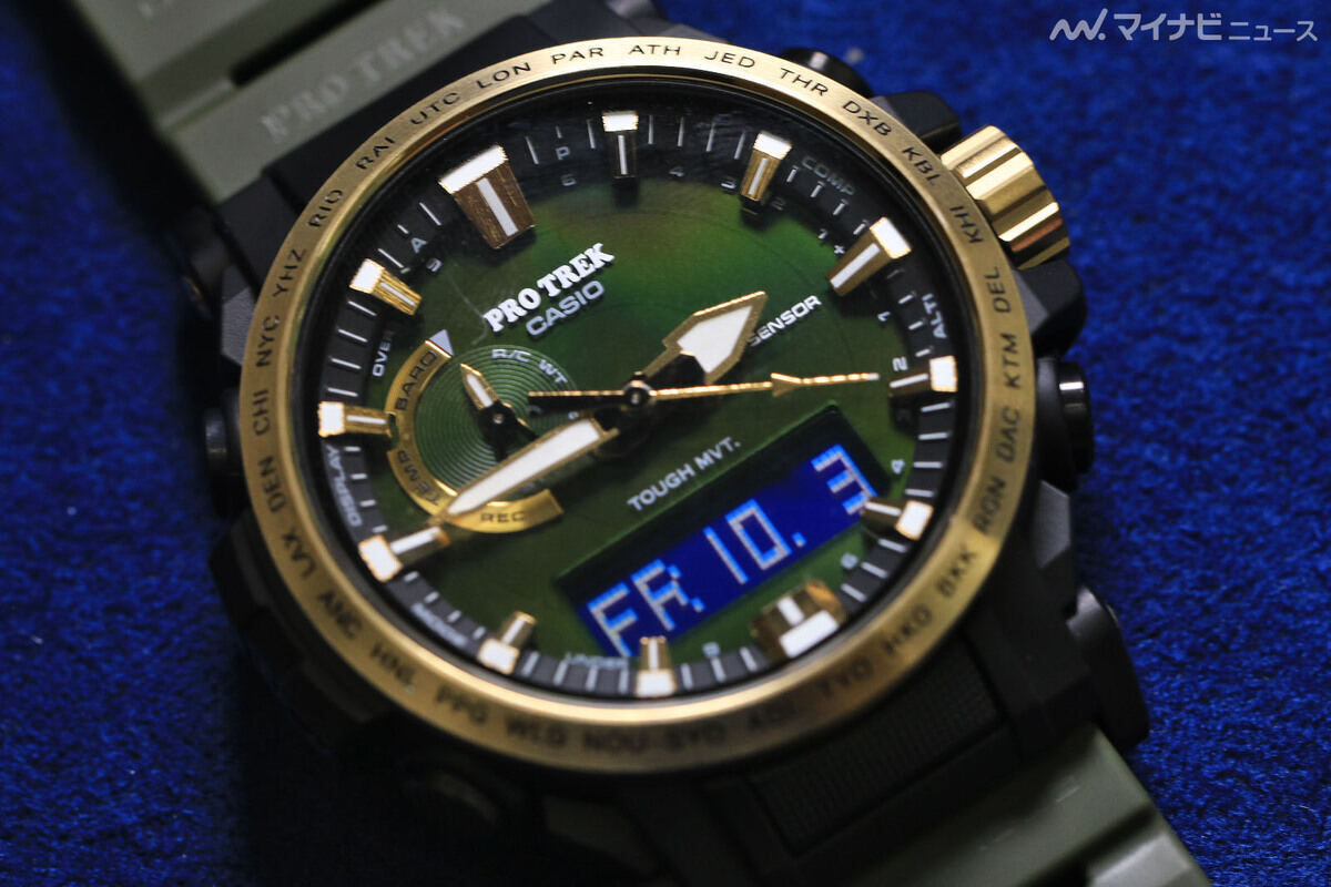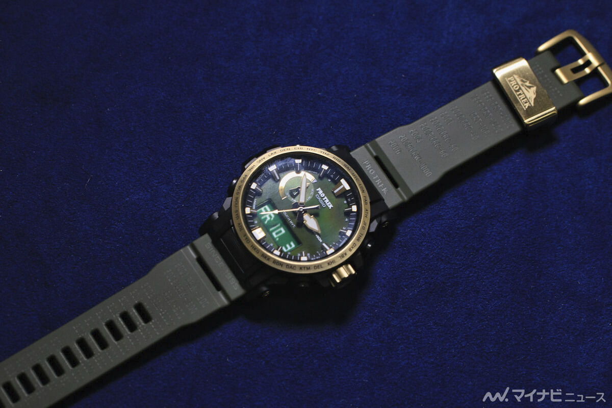 De PRW-61ANS-3 onthult bij nadere belichting een rijke olijfgroene wijzerplaat met veel diepte. De gouden indexen en wijzers met dampdepositie vangen het licht op met een glans, waardoor de analoge elementen eruit springen zonder te reflecterend over te komen. Zelfs de digitale subwijzerplaat zit nu schoner. Het is duidelijker omlijst in het onderste gedeelte van de wijzerplaat. Het is ook makkelijker om de radiale textuur onder het Pro Trek logo te zien.