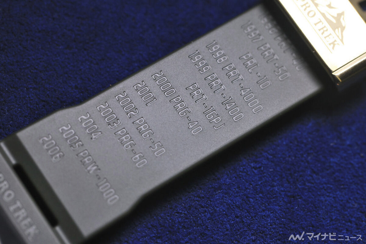 Wat echt opvalt in deze nieuwe serie afbeeldingen is het bandje. Een nadere blik op de gegoten hars onthult scherpere jaarmarkeringen in de Pro Trek tijdlijn, van de vroegste modellen in de jaren '90 tot de iconische releases van de jaren 2000. De lettergrootte en de kwaliteit van de stempels lijken consistent voor beide modellen, maar de olijfkleurige band van de PRW-61ANS-3 lijkt iets dieper in natuurlijk licht - mogelijk door de textuur van het materiaal. De goudkleurige gesp en de hardware van de houder zien er nu ook iets minder opzichtig uit.