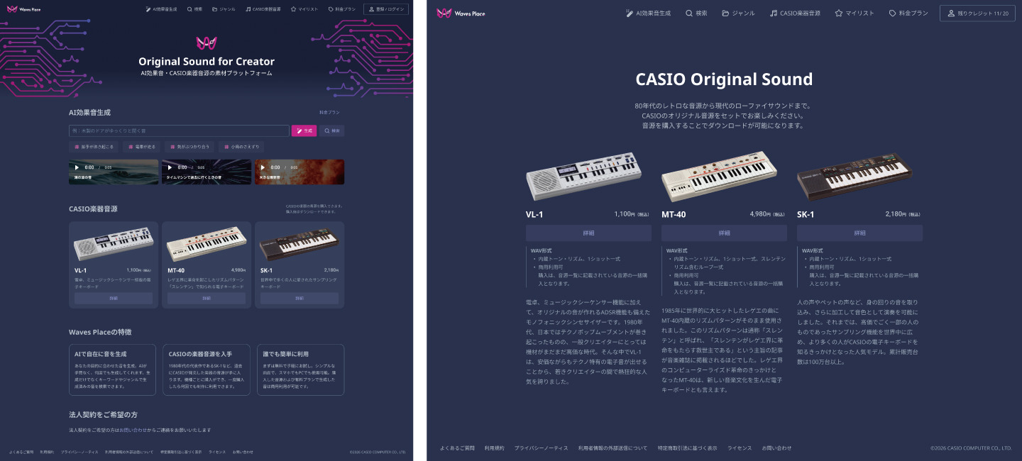 Casio Computer Co., Ltd. is begonnen met de verkoop van officiële geluidsbronnen van drie van haar klassieke elektronische keyboards uit de jaren '80 via Waves Place, een AI-service voor het genereren van geluidseffecten. De nieuwe releases bevatten geluiden van de Casio VL-1, Casio SK-1 en Casio MT-40. Alle drie de pakketten zijn op 25 maart live gegaan.