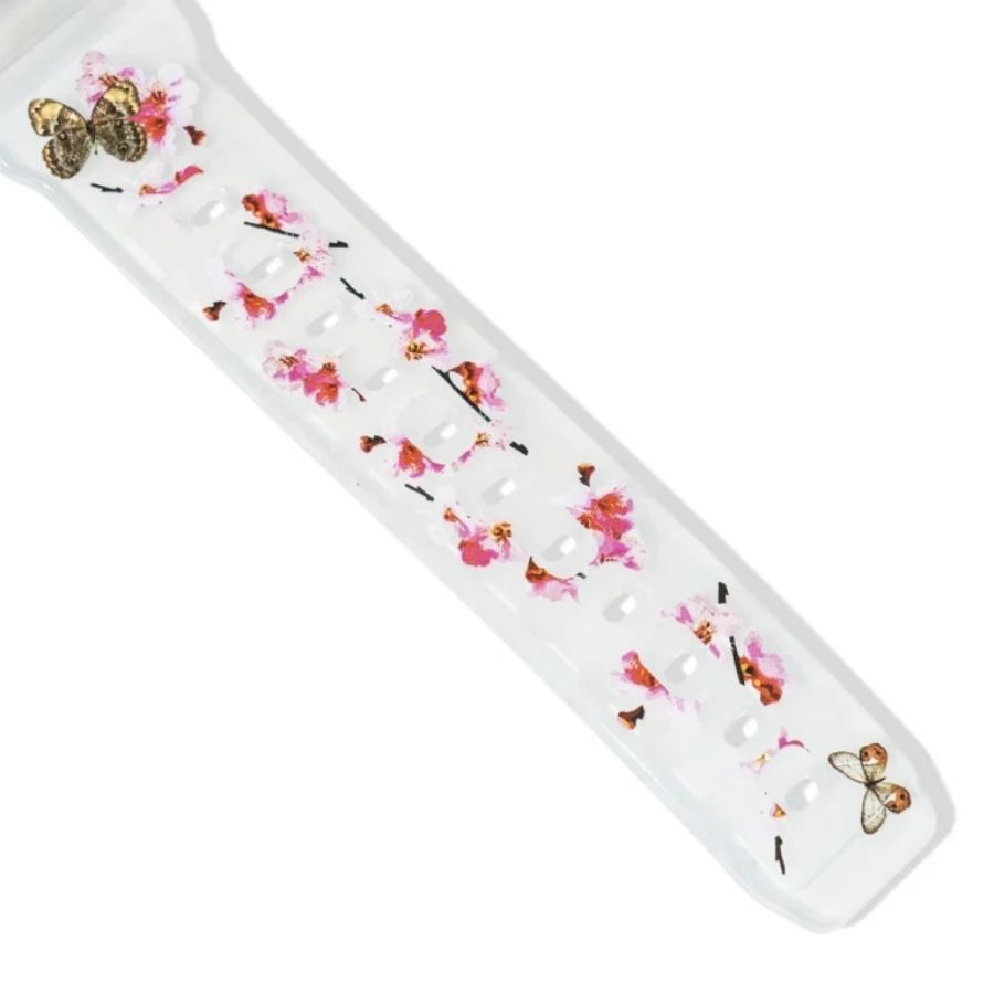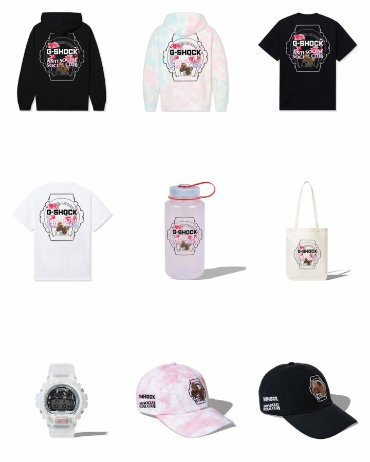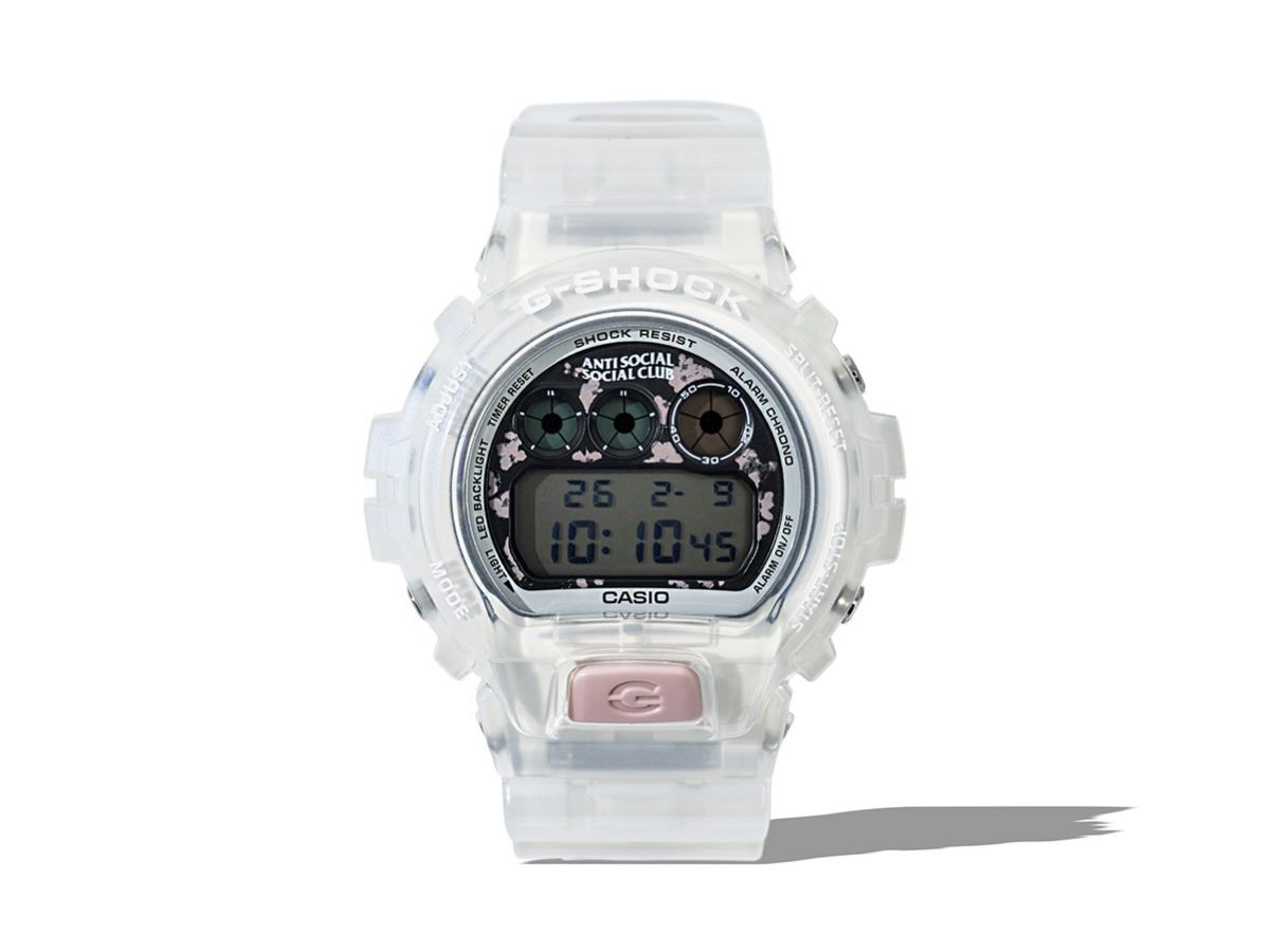 De nieuwe G-Shock x Anti Social Social Club DW-6900 is een skelethorloge met een doorschijnende lunette, die een witte behuizing onthult. Deze omringt een zwarte wijzerplaat met een lichtroze kersenbloesemmotief, met een bijpassende roze 'G'-knop. De doorzichtige band is versierd met roze bloemen en vlinders, het populaire Kkotch-design van het merk. Bovendien worden, wanneer gebruikers de LED-achtergrondverlichting verlichten, de woorden 'Get Weird' op de achtergrond van het grotere digitale display weergegeven.