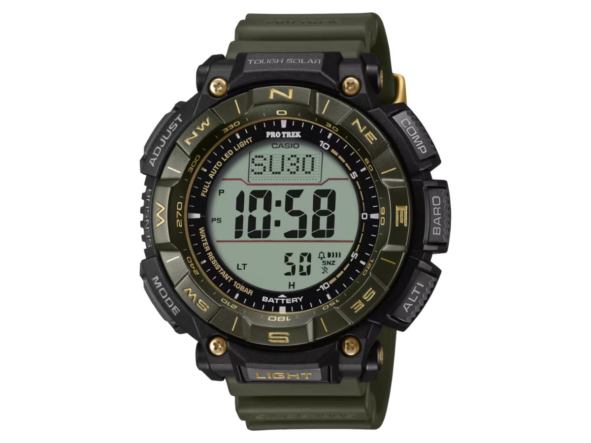 Casio's Pro Trek PRG340ANS-3 is een horloge met drie sensoren dat kan worden gebruikt voor kompaspeilingen, barometrische druk, hoogte en temperatuurmetingen. Het biedt ook tijden van zonsopgang en zonsondergang voor een gekozen datum. Andere typische functies zijn ondersteuning voor de wereldtijd, een stopwatch, een afteltimer en vijf dagelijkse alarmen. Bovendien ondersteunt het Tough Solar opladen en is het waterbestendig tot 100 m. Of en wanneer dit speciale Casio Pro Trek horloge in Europa wordt uitgebracht, valt nog te bezien.
