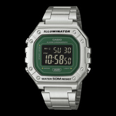 De W-218HD-3AV is het model dat alleen digitaal is en is het enige model in de serie dat is uitgerust met een roestvrijstalen band en drievoudige vouwsluiting. Het maakt gebruik van een klassiek vierkant industrieel ontwerp met compacte afmetingen in plaats van het oversized ontwerp van de andere twee modellen. Het is heel gemakkelijk om de technische compromissen op te merken: de waterbestendigheid is teruggebracht tot 50 meter en de batterijlevensduur van 7 jaar is weliswaar geweldig, maar houdt het midden tussen de analoge en hybride modellen. Het gebruik van een metalen band verhoogt het gewicht tot 85 g, waardoor dit het zwaarste model in de serie is ondanks de kleinste behuizing.