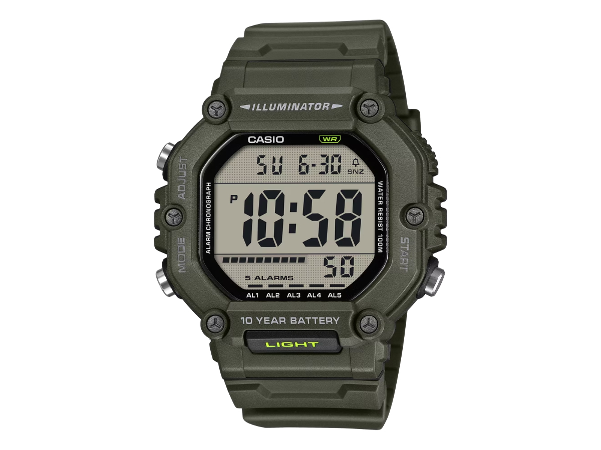 De AE-1600 van Casio is een horloge met twee tijden, met tools zoals een stopwatch, een afteltimer en vijf dagelijkse alarmen. Het digitale display kan met een druk op de knop worden verlicht met een amberkleurige LED-achtergrondverlichting. Andere opvallende kenmerken zijn 100 m waterdichtheid en een langere batterijlevensduur van 10 jaar van de CR2032-batterij.