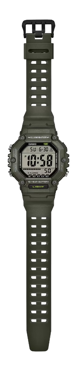 De Casio AE-1600HX-3AV heeft een oversized behuizing van donker olijfgroen hars van 54,1 x 49,7 x 15,9 mm (~1,78 x 1,96 x 0,63 inch), met daaromheen een groot LCD-scherm met een lichte achtergrond. De "X" in het modelnummer lijkt te verwijzen naar de extra lange band. Hoewel het bedrijf geen exacte lengte opgeeft, laat een marketingafbeelding (hieronder) de extra lengte zien in vergelijking met de band van de oudere AE-1600H-1AV. Een ander verschil met het rally bandje zijn de zij-aan-zij gaten voor een betere pasvorm.