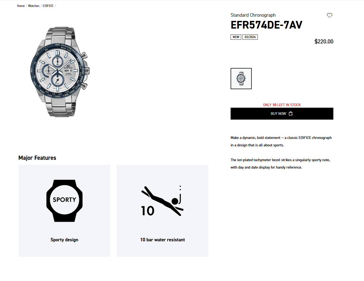 Casio heeft een nieuwe Edifice chronograaf beschikbaar gemaakt in de VS - de EFR574DE-7AV. Het eerder uitgebrachte horloge staat nu op de officiële winkel van het bedrijf voor 220 dollar. Het model is het nieuwste in de standaard Edifice chronograaf line-up van het merk en heeft een sportief ontwerp, met een tachymeter bezel en multi-subdial lay-out.