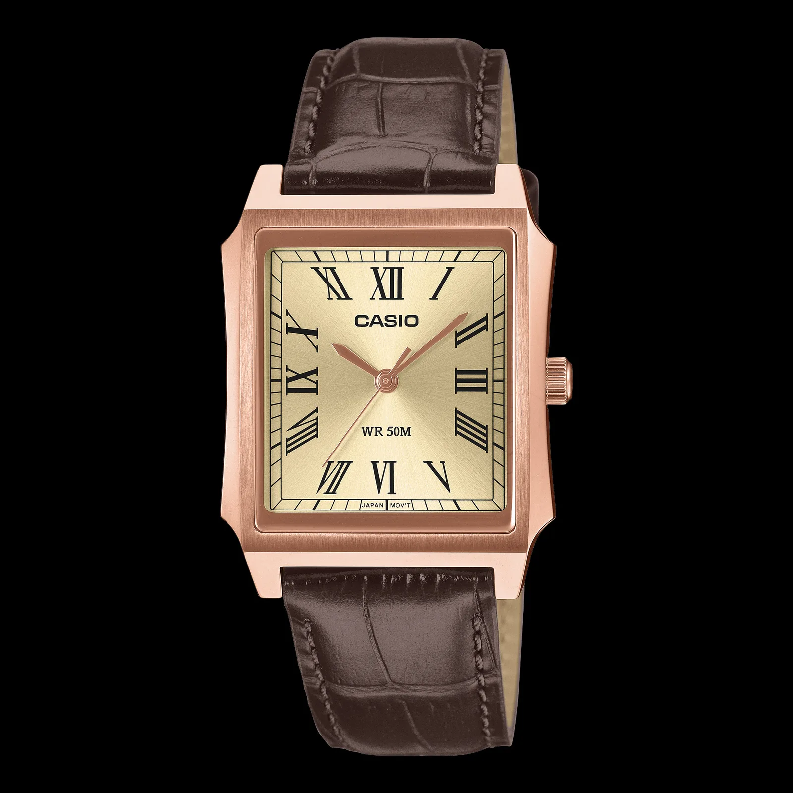 De MTP-B190L-7BV wordt geleverd met een echt lederen band en een zilverkleurige kast. De MTP-B190RGL-9BV heeft een roségouden geïoniseerde kast en een bruine leren band. De MTP-B190SG-9BV heeft een roestvrijstalen band met goudkleurige ion-plating en een one-touch drievoudige sluiting. De MTP-B190G-9BV heeft zowel een gouden geïoniseerde kast als band.