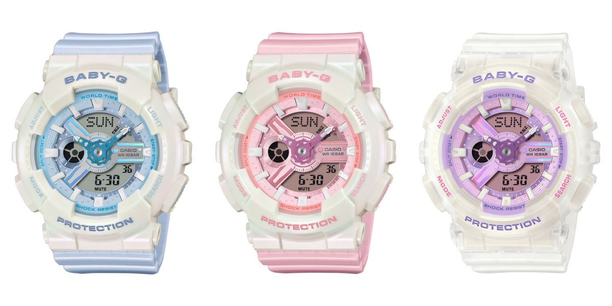 Drie nieuwe Casio G-Shock Baby-G BA-100 serie horloges zijn gelanceerd in Japan. De BA-110PD-2A, de BA-110PD-4A en de BA-110PS-7A, die ook voor andere markten wereldwijd zijn gepland, hebben pastelkleurige ontwerpen en worden op de markt gebracht als "zeer praktisch en serieus functioneel".