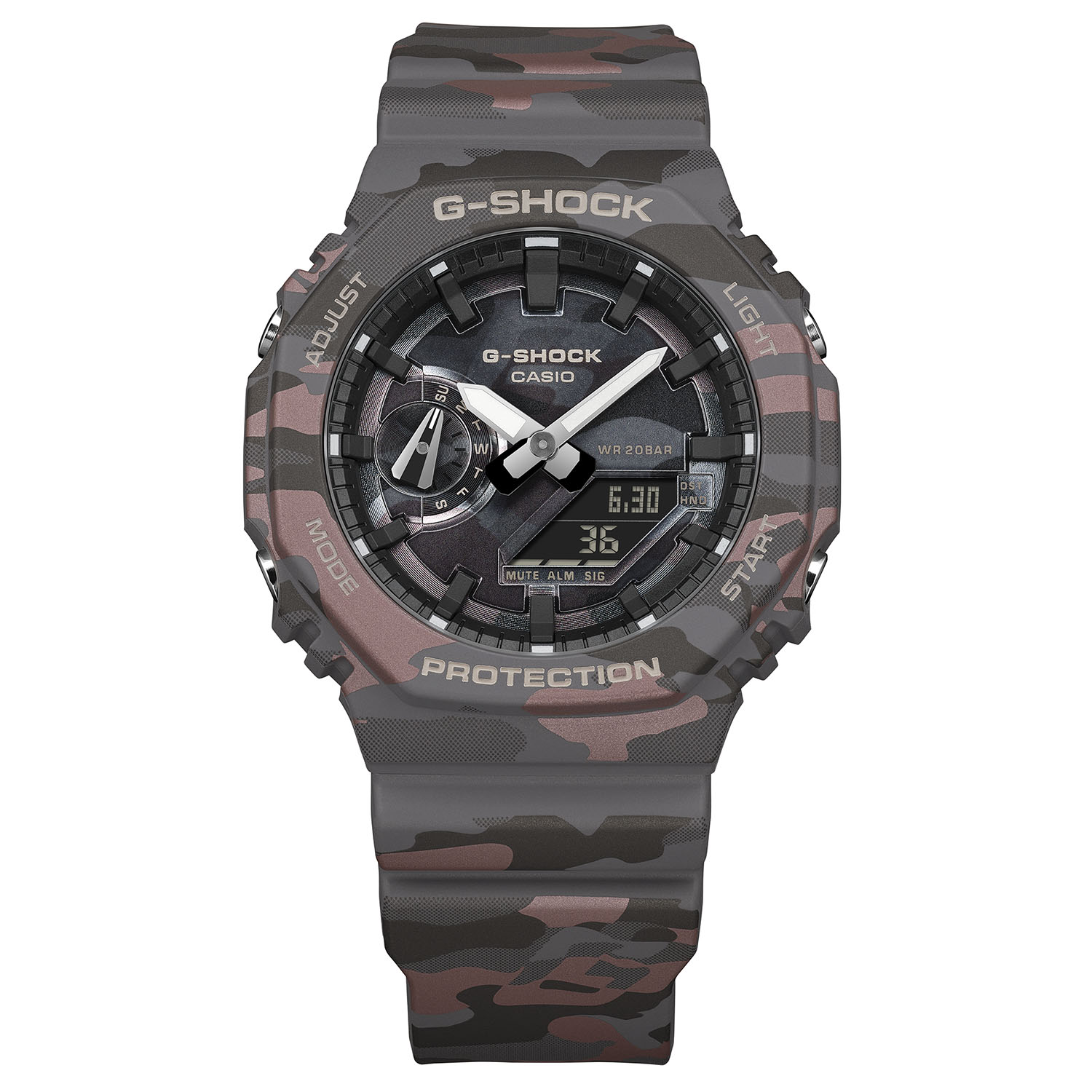 De GA-2100-serie van Casio, die wordt gekenmerkt door zijn achthoekige lunette en hybride analoog-digitaal display, krijgt nu officieel drie nieuwe kleurstellingen: zandkleurig (GA-2100CM-5), grijs (GA-2100CM-8) en een derde variant met roodachtige tinten (GA-2100CMD). De harscomponenten zijn ook bedrukt met metallic. Dit fabricageproces zorgt voor een meerlagig camouflage-effect waarin de merknaam - het G-merk - direct in het patroon is geïntegreerd. Terwijl eerdere versies van de GA-2100 gegoten kleurhars of standaard tampondruk gebruikten, is het gebruik van metallic details op deze modellen bedoeld om een hogere mate van visuele diepte te bieden in vergelijking met standaard varianten.