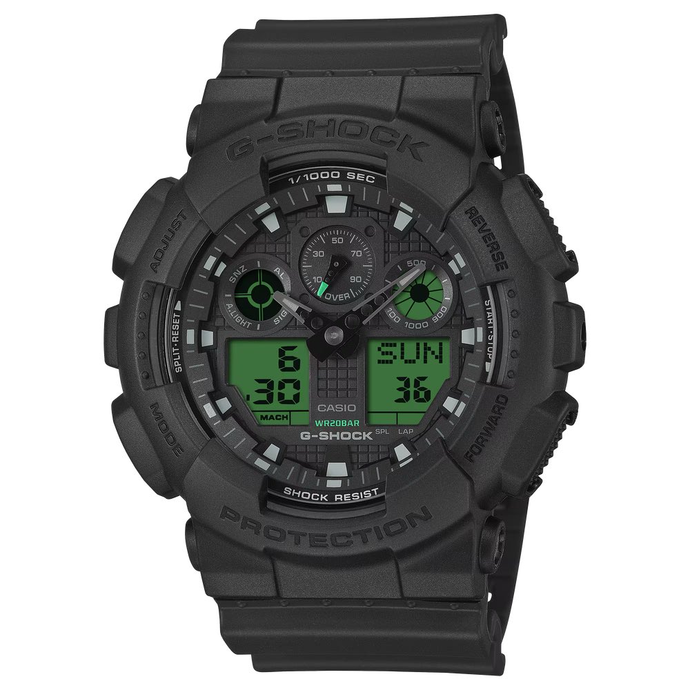 De volgende is de GA-100BEG-1A (¥18,700). Dit robuuste digitaal-analoge model heeft Casio's klassieke drievoudige grafiekindeling, met twee elektro-groene LCD-schermen aan de onderkant die een effectief contrast vormen met de stealthy zwarte kast. Het horloge heeft groene wijzers en accenten op de subdials en combineert een mechanische esthetiek met robuuste JIS Klasse 1 antimagnetische weerstand en een batterij die twee jaar meegaat.