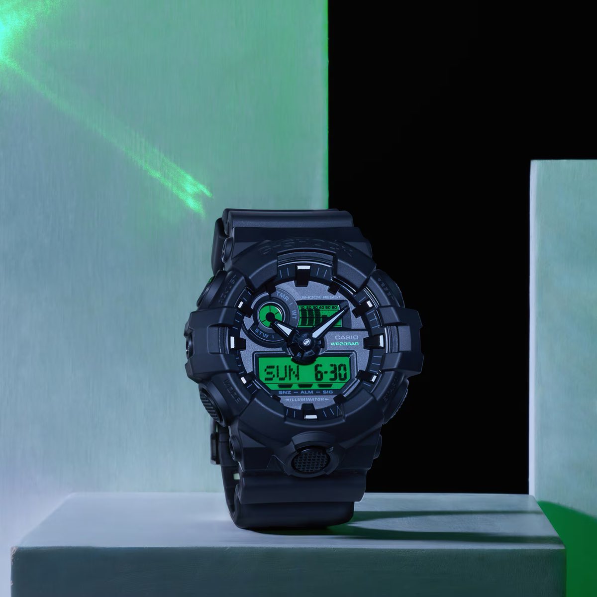 De GA-700BEG-1A heeft een opvallend gedurfder silhouet, met agressieve harsbumpers en een opvallende lichtknop met textuur aan de voorkant. In plaats van schermen met twee secties, gebruikt het een enkel, strak elektrogroen LCD-scherm in combinatie met grote 3D wijzers en een ronde subdial. Er is geen antimagnetische afscherming, maar de batterij heeft een levensduur van vijf jaar. De prijs is ¥18,700, hetzelfde als de GA-100BEG.