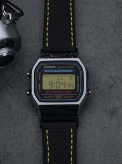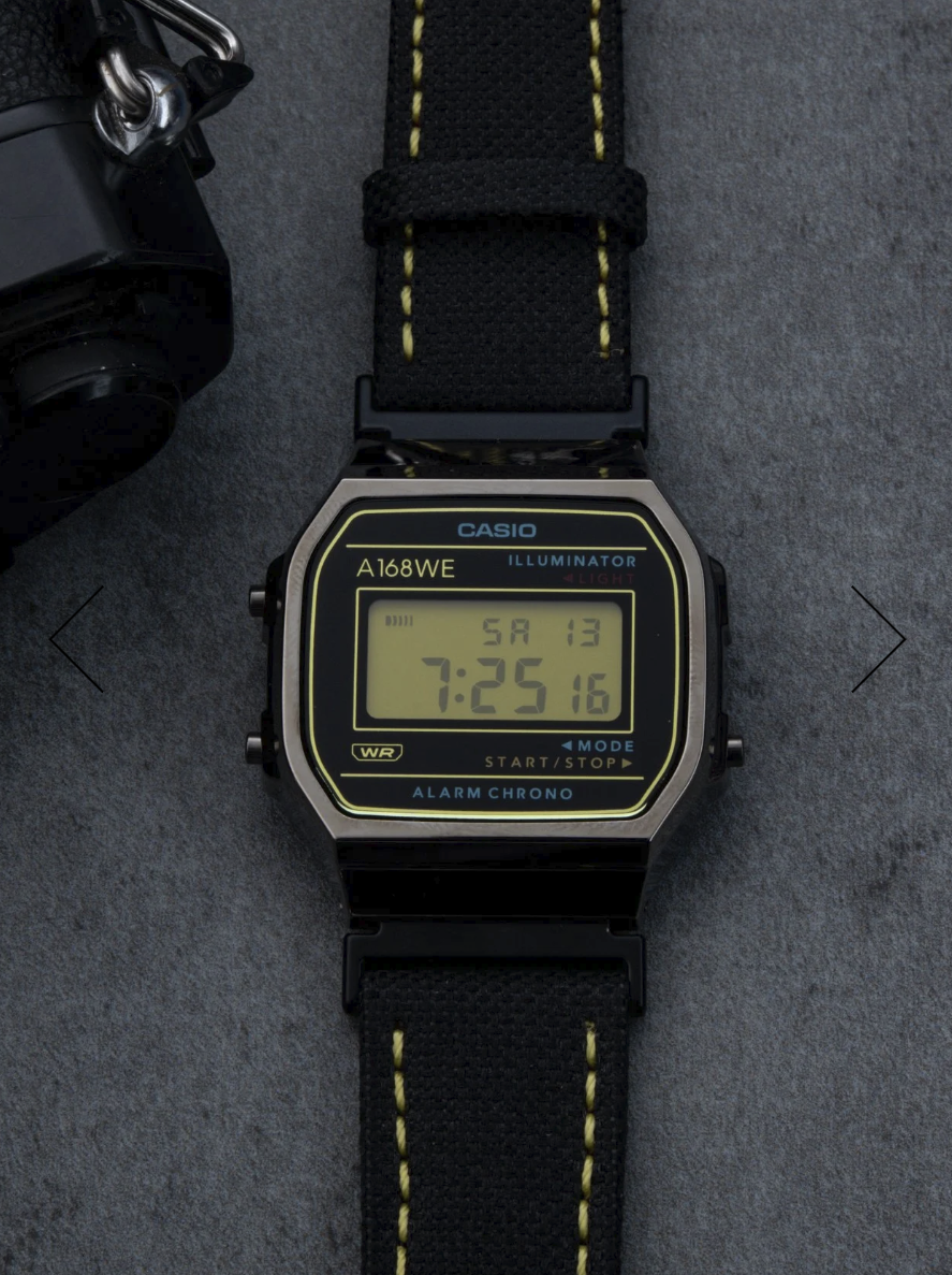 Het onderliggende horloge is niet veranderd. Het maakt nog steeds gebruik van de standaard A168 digitale module met alarm, stopwatch en achtergrondverlichting. Er zijn geen aanwijzingen voor functionele upgrades, dus de nadruk ligt hier duidelijk op stijl en ontwerp in plaats van op bonusfuncties. Het display heeft een gele tint, wat een duidelijke verwijzing is naar Nikon's kleur. De band is gemaakt van zwart canvas met gele stiksels, wat erg lijkt op camerariemen. De vorm van de behuizing blijft dicht bij het origineel. Branding zoals "Illuminator" is nog steeds zichtbaar, wat duidelijk maakt dat dit geen volledig herontwerp is.