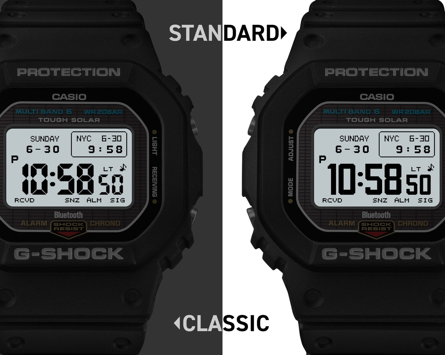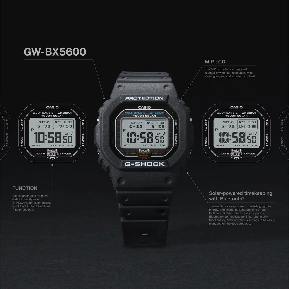 De functionaliteit neemt toe met volledig opladen op zonne-energie, Multi Band 6 atoomtijdsynchronisatie en nu Bluetooth, zodat gebruikers hun horloge nu met een smartphone kunnen synchroniseren voor directe klokcorrectie en toegang tot de Casio Watches app voor controle over de weergave-indeling, tijd- en plaatsregistratie en meer. Het MIP LCD-scherm ondersteunt meerdere displaylay-outs die via de app kunnen worden omgeschakeld - gebruikers kunnen nu de dichtheid en het contrast van de informatie aanpassen.