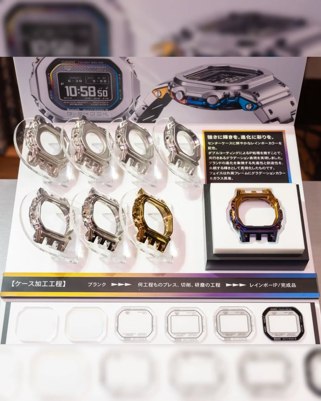 Op een van de duidelijkere foto's is ook de gelaagde constructie van de kast te zien. Meerdere onafgewerkte metalen omhulsels worden getoond naast een voltooide, met regenboogkleur behandelde eenheid, om het meerstappen bewerkings- en afwerkingsproces weer te geven. Het zijprofiel laat nog een detail zien dat eerder niet zo duidelijk was. De bezel, kast en interne structuur lijken meer gesegmenteerd dan op oudere GMW-B5000 modellen. Er zijn duidelijke overgangen tussen de gepolijste stalen oppervlakken en het gekleurde binnenframe. De schroeven en drukkers contrasteren ook lichtjes in kleur.