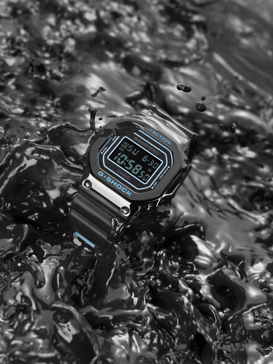 Terwijl de oorspronkelijke aankondiging zich richtte op de basis - een gepolijste zwarte afwerking, negatief LCD-scherm en Bamfords handelsmerk van lichtblauwe accenten - geven deze nieuwe afbeeldingen ons een iets beter idee van de persoonlijkheid van het horloge. Een dramatische productfoto plaatst de GM-5600 in een dikke zwarte vloeistof. Op een andere foto lijkt het horloge te smelten of te druipen, waardoor de glans van de glanzende buitenkant zichtbaar wordt. Beide afbeeldingen tonen het esthetische contrast tussen het matte Bamford-logo op het bandje en de gepolijste metalen kast.