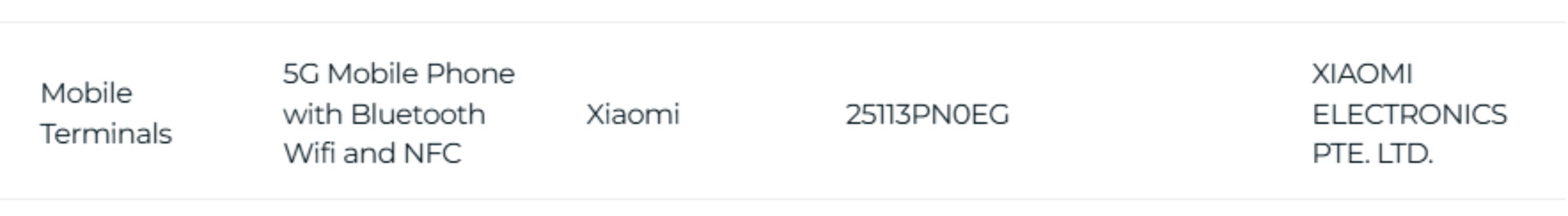 Nu is de wereldwijde versie van de Xiaomi 17 opgedoken in de openbare database van de Infocomm Media Development Authority (IMDA) in Singapore. De regelgevende instantie heeft met name '25113PN0EG' gecertificeerd, zoals de afbeelding hieronder laat zien. Op basis van de modelnummernomenclatuur van Xiaomi zou 25113PN0EG de wereldwijde versie moeten zijn van 25113PN0EC, een modelnummer dat is toegewezen aan de Chinese versie van de Xiaomi 17.