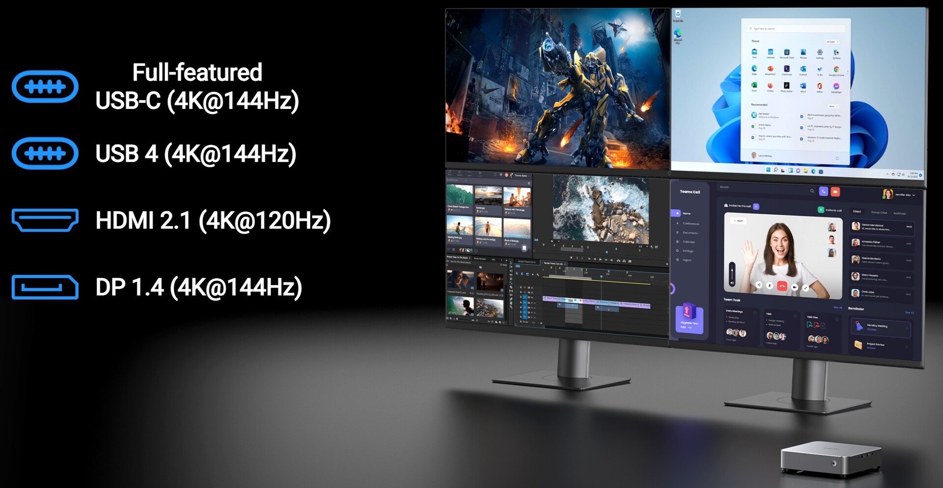 Dankzij de USB 4, USB-C, HDMI en DisplayPort van de AuBox 8745HS kunnen gebruikers tot vier 4K-schermen tegelijk aansluiten. USB 4, USB-C en HDMI bieden ultravloeiende beelden tot 4K@144Hz, perfect voor gaming, productiviteit en meeslepende multimedia-ervaringen.