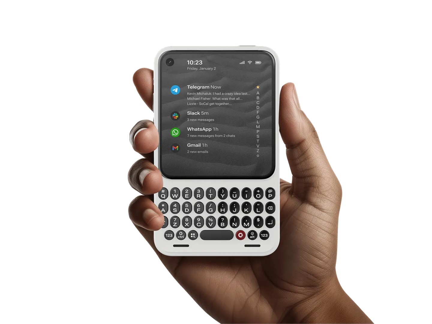 Het toetsenbord is aanraakgevoelig, zodat u door apps en webpagina's kunt scrollen zonder het scherm aan te raken. Er zit ook een vingerafdrukscanner onder de spatiebalk. Bovendien kunnen gebruikers aangepaste snelkoppelingen toewijzen aan de rode Clicks-toets op het toetsenbord