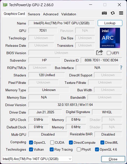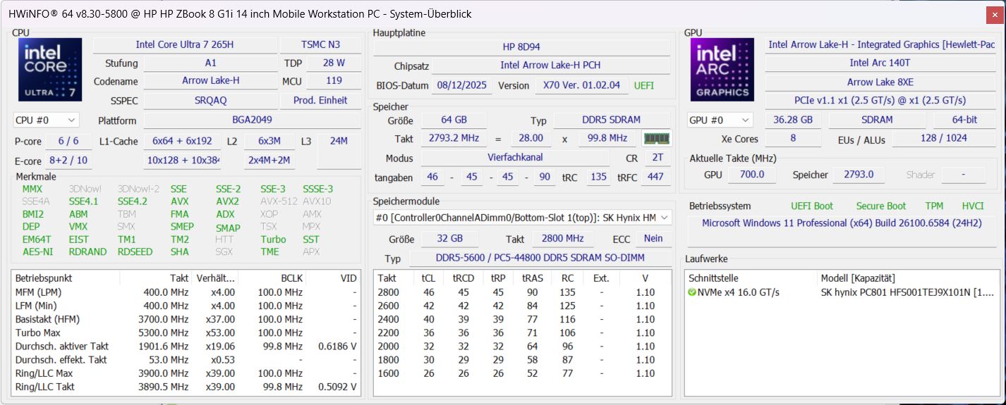 HP ZBook 8 G1i 14 Intel Core Ultra 7 255H ⎘ Intel Arc Graphics 140T ⎘ 32 GB Geheugen, 1024 GB SSD | Amazon: $2,968.00 Catalogusprijs: 1860 Euro | 1.7 kg | 23 mm | 14.00" 2560x1600 216 PPI IPS LED | |