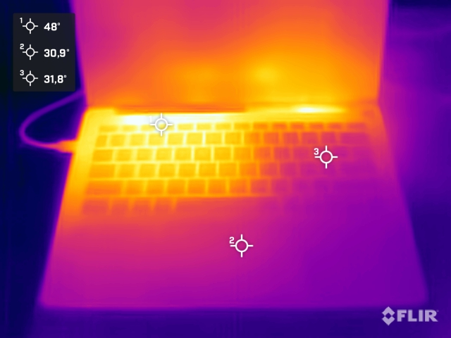 (-) De maximumtemperatuur aan de bovenzijde bedraagt 47.3 °C / 117 F, vergeleken met het gemiddelde van 35.9 °C / 97 F, variërend van 21.4 tot 59 °C voor de klasse Subnotebook.