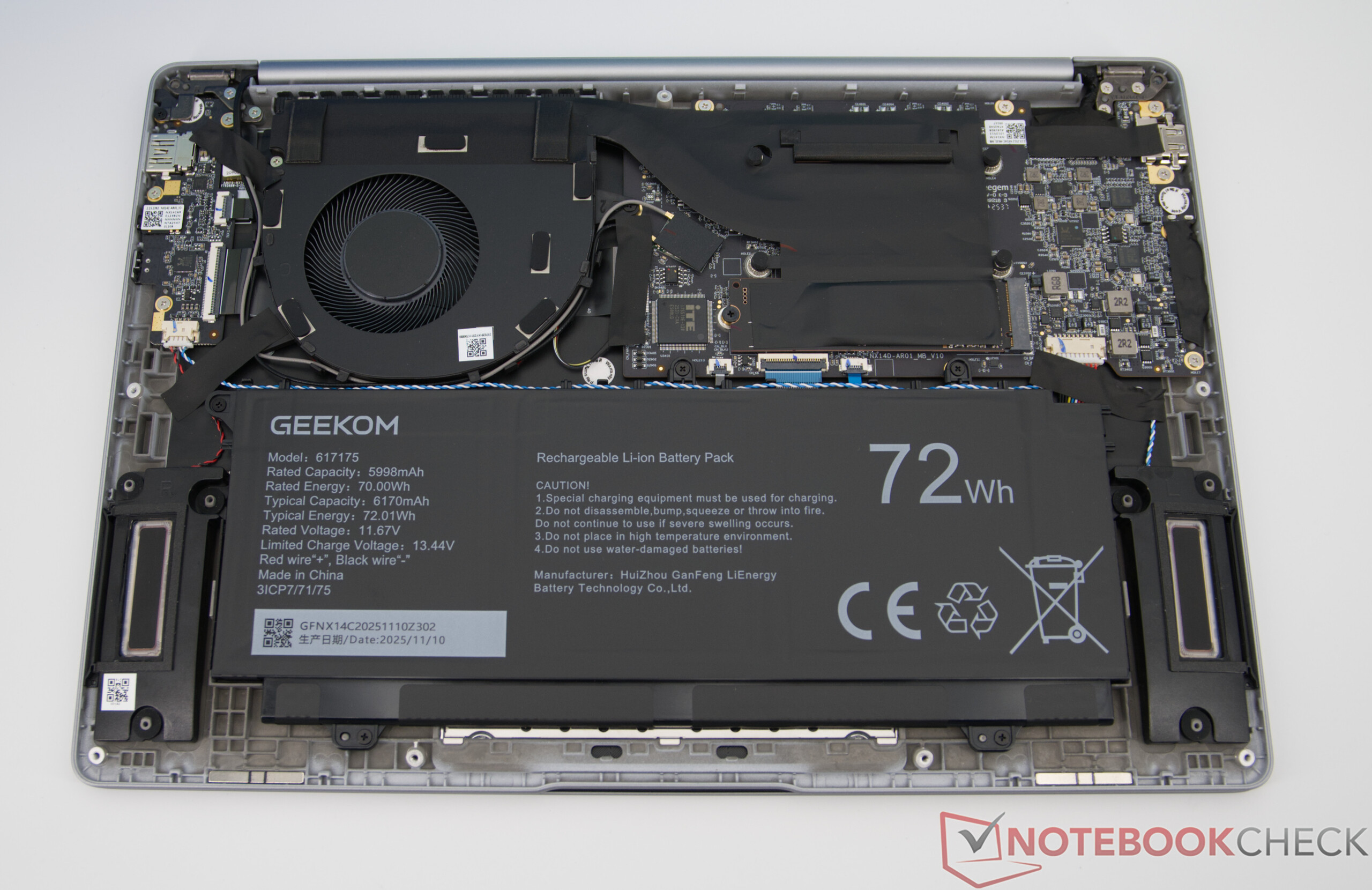 De GeekBook X14 Pro vertrouwt op een accu met een capaciteit van 72 Wh, die een behoorlijke werktijd mogelijk maakt bij gemengd dagelijks gebruik van kantoor, web en streaming, en mobiel werken gedurende enkele uren mogelijk maakt. Afhankelijk van het gebruik kan een groot deel van een werkdag zonder stopcontact worden doorgebracht. Als de batterij leeg is, duurt het ongeveer drie uur om hem volledig op te laden.