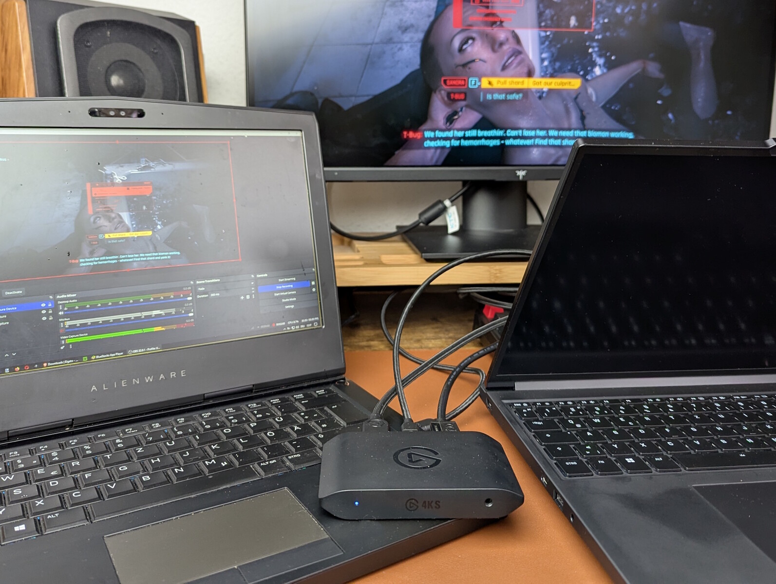 - PC gaming vastleggen: We hebben een XMG Pro 16 gaming laptop aangesloten op de 4K S en gameplay van Cyberpunk 2077 in 4K opgenomen. Een tweede laptop was via USB-C aangesloten op de capturekaart en was verantwoordelijk voor het opnemen in de Elgato app of OBS. We keken ook naar de latentie.