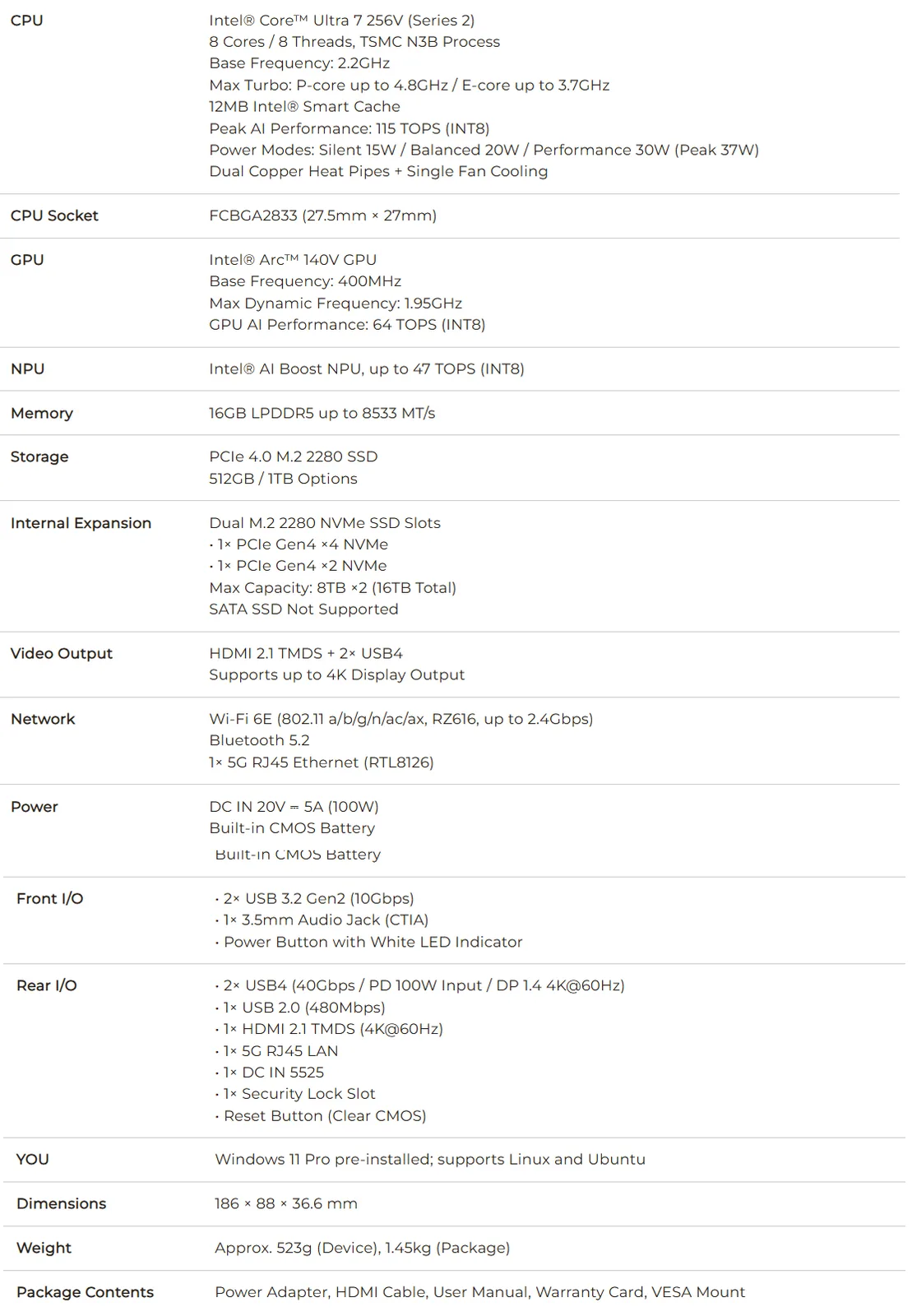 Onder de motorkap is deze kleine mini-PC uitgerust met de Intel Core Ultra 7 256V, een processor uit het hogere middensegment van de Lunar Lake reeks. Hij is voorzien van de Arc 140V iGPU, die een flink aantal moderne games met een resolutie van 1080p probleemloos aankan met aanpassingen aan de visuele instellingen.