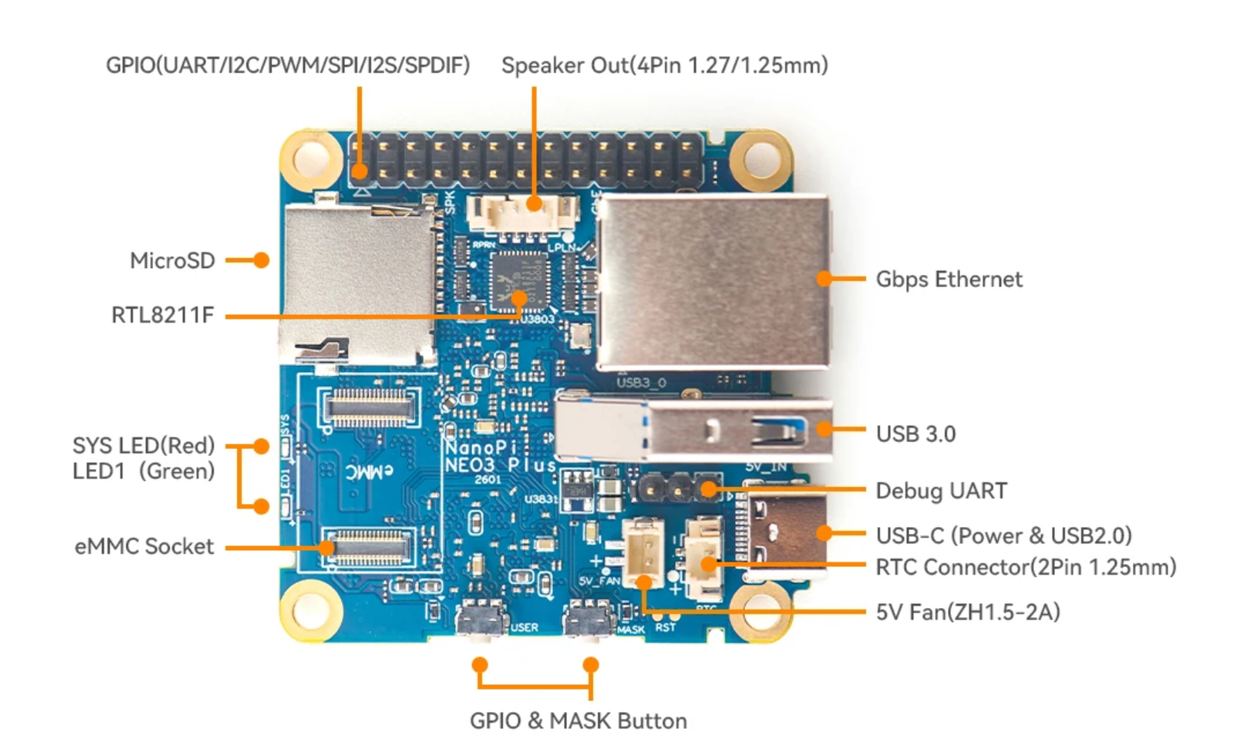 Bovendien heeft FriendlyElec connectoren toegevoegd voor het aansluiten van stereoluidsprekers, evenals een 5V fan header, debug UART en een eMMC socket. Het bord van 48 x 48 mm en 21,5 g bevat ook rode en groene LED's plus een 2-pins RTC-connector. Volgens de wiki van het bedrijf https://wiki.friendlyelec.com/wiki/index.php/NanoPi_NEO3_Plusondersteunt de Neo3 Plus meerdere Linus 6.1 LTS forks, waaronder Debian 13 Core en Ubuntu Core 24.04.