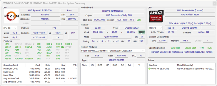 | Lenovo ThinkPad X13 G6 AMD AMD Ryzen AI 7 PRO 350 ⎘ AMD Radeon 860M ⎘ 32 GB Geheugen, 1024 GB SSD | Catalogusprijs: 1855€ | 1.1 kg | 13 mm | 13.30" 1920x1200 170 PPI IPS | |