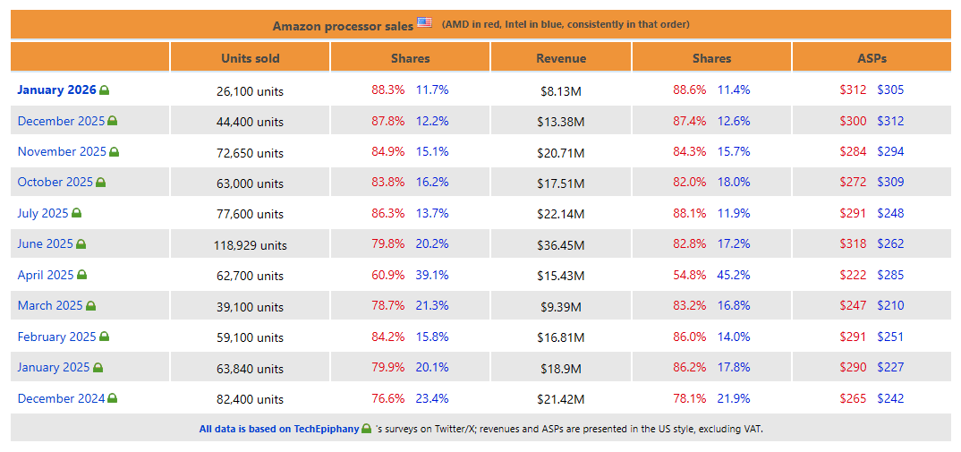 Een totaal van 26.100 CPU's verkocht in januari 2026 op Amazon US ziet er op het eerste gezicht misschien behoorlijk uit. Maar als we de CPU-verkoop van januari 2026 vergelijken met die van januari 2025, zien we een zorgwekkende trend: Veel consumenten/gamers upgraden niet.