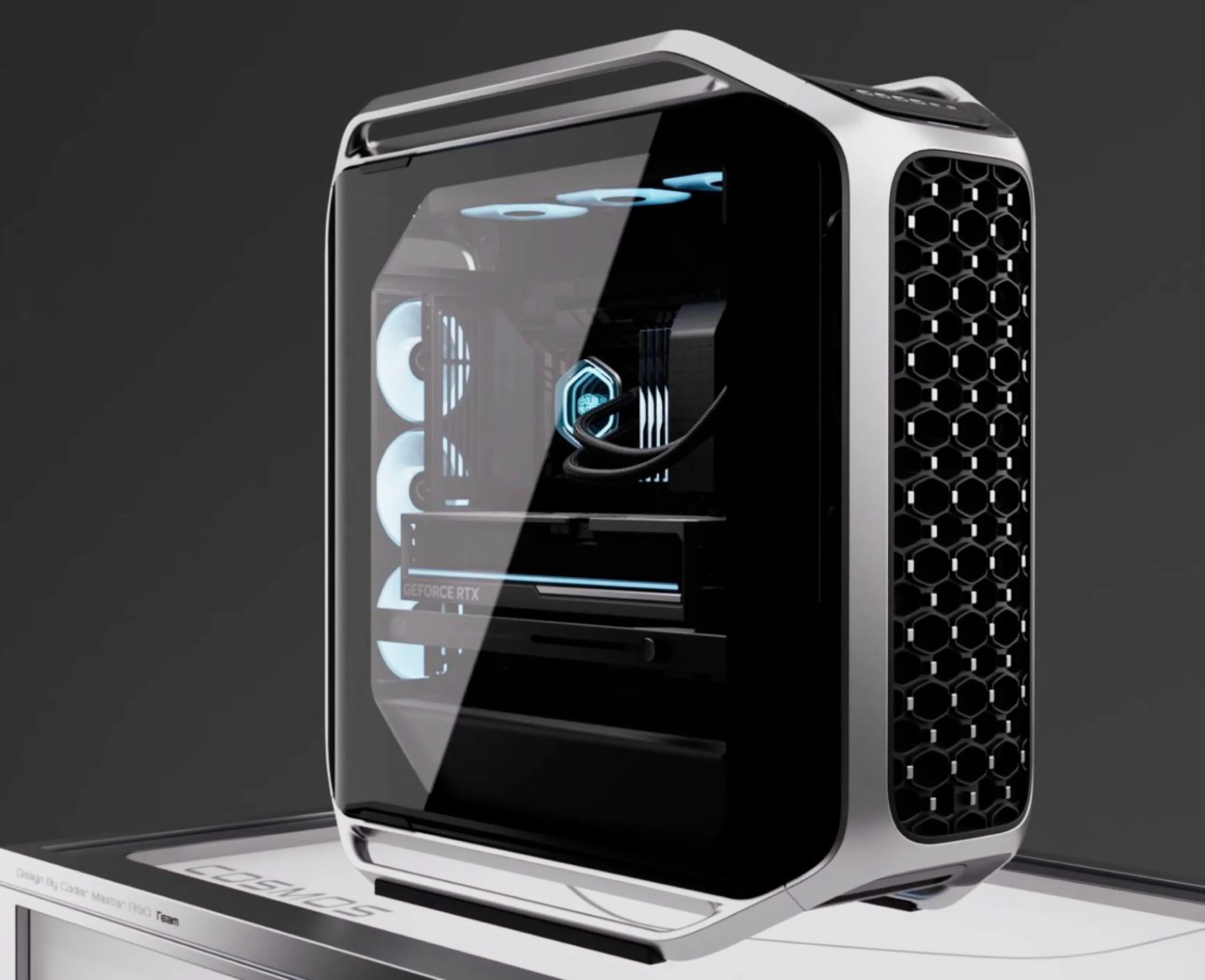 De Cooler Master Cosmos Alpha is een nieuw paradepaardje van de pc-tower die een aluminium frame combineert met een glazen zijpaneel. Het frame gaat naadloos over in voetjes en handgrepen, wat het transport vereenvoudigt. Het voorpaneel is geperforeerd om de luchtstroom naar de ventilatoren erachter te maximaliseren.