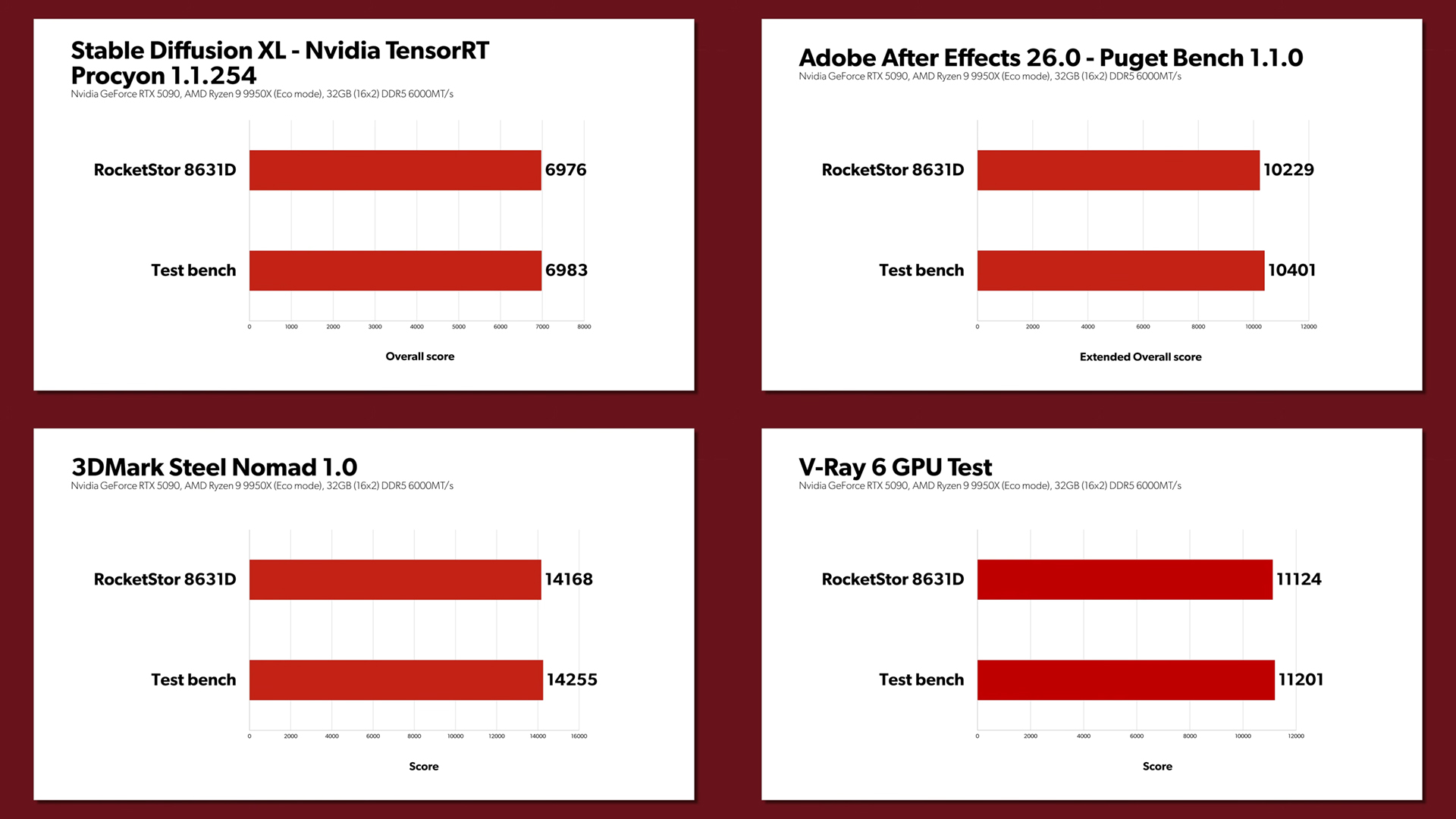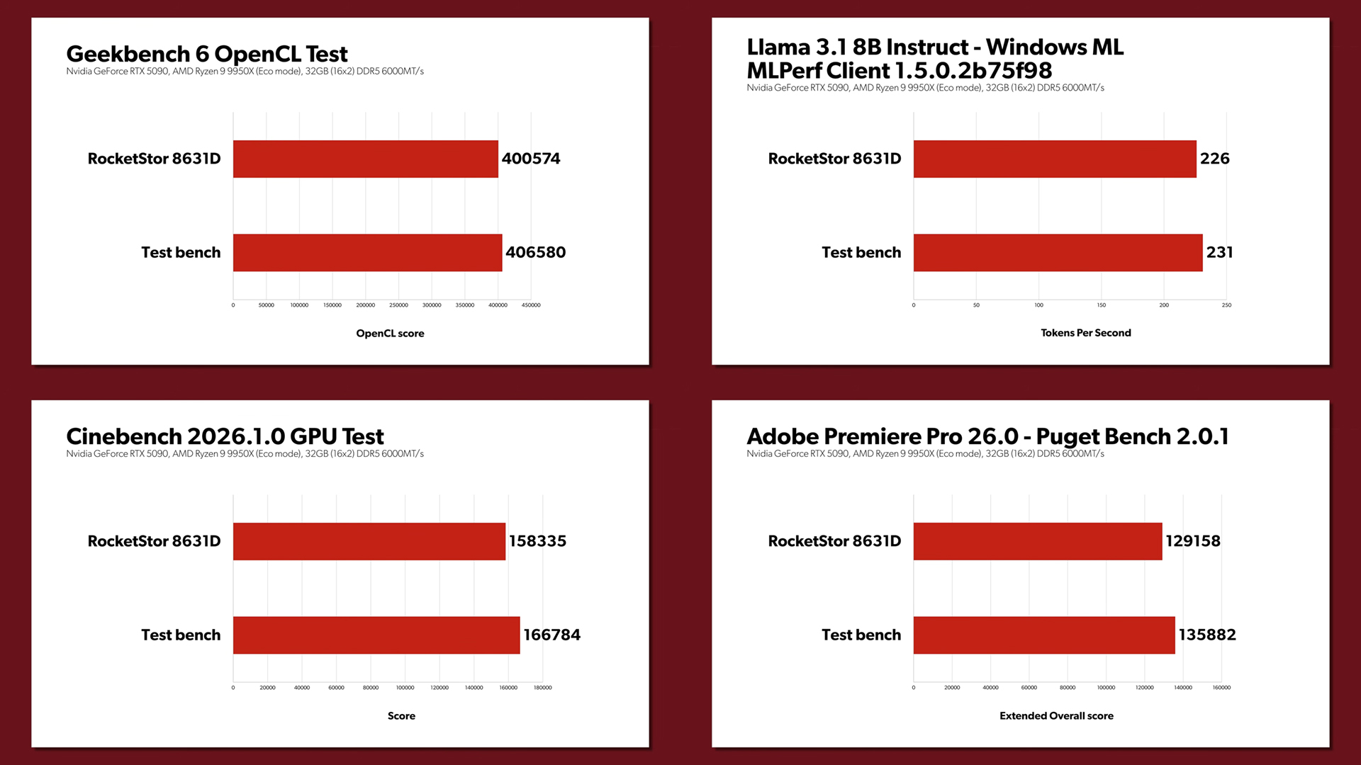 PCWorld heeft een CopprLink-opstelling op de proef gesteld met een desktop Nvidia RTX 5090. Deze opstelling gebruikte de RocketStor 8631D van HighPoint, die gebruik maakt van CopprLink-bekabeling. In tegenstelling tot een gewone eGPU-opstelling, kan deze echter niet rechtstreeks op een desktop, laptop of gaming-handheld worden aangesloten.
