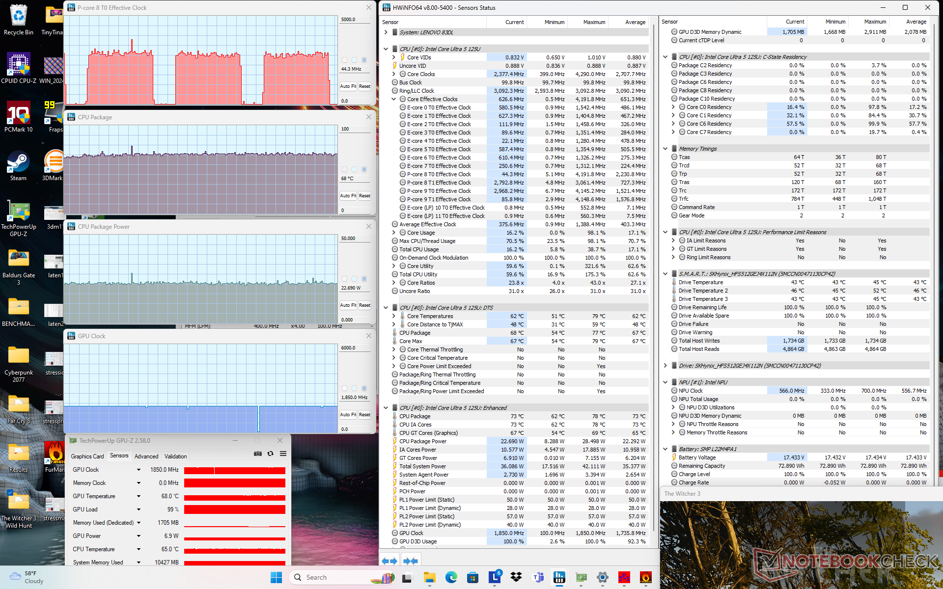 Als u Witcher 3 met een hoge belasting zou 30 W verbruiken, vergeleken met 44 W op het 2023 model. Als u bedenkt dat onze geïntegreerde Arc 4 vergelijkbaar presteert met de oudere Iris Xe 96 EU's, is de winst in prestaties-per-watt aanzienlijk en een hoogtepunt van de Meteor Lake serie. De energiebesparingen komen overeen met het over het algemeen stillere ventilatorgeluid en de langere batterijlevensduur, zoals vermeld in hun respectieve secties.