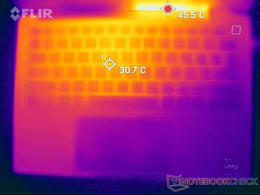 De oppervlaktetemperaturen zijn zeer koel bij lage belastingen, aangezien het grootste deel van het chassis uit metaal bestaat. Bij hogere belastingen kunnen de hete plekken echter oplopen tot respectievelijk 41 C en 50 C aan de boven- en onderkant. De hete plekken bevinden zich aan de achterkant van het chassis, zodat het toetsenbord en de palmsteunen koeler blijven voor comfortabel typen. De concurrerende Dragonfly Max bereikt vergelijkbare maxima, terwijl de Summit E13 Flip nog warmer kan worden tot 57 C.