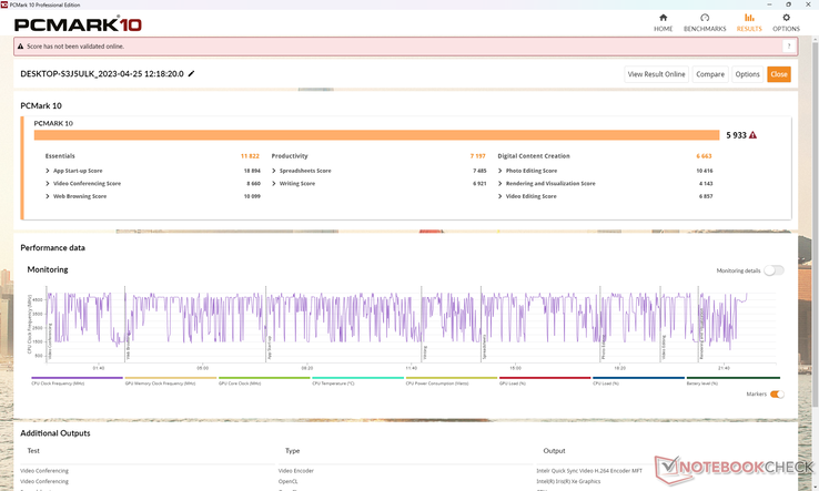 Bij het uitvoeren van Prime95 stress, stijgen CPU kloksnelheden en opgenomen vermogen tot respectievelijk 4,1 GHz en 58 W, totdat de kerntemperatuur slechts enkele seconden later 95 C bereikt. Daarna nemen de kloksnelheden en het opgenomen vermogen langzaam af tot ze zich stabiliseren op respectievelijk 2,6 GHz en 25 W. De duurzaamheid van Turbo Boost is beperkt, wat niet ongewoon is bij convertibles.