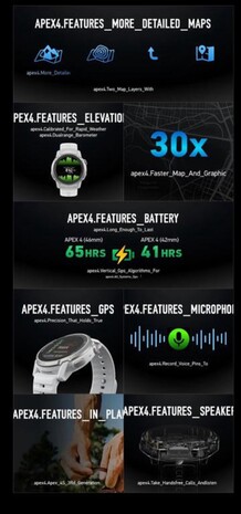 Volgens een van deze marketingafbeeldingen heeft de Coros Apex 4 30 keer meer prestaties bij het gebruik van kaarten en het renderen van afbeeldingen, terwijl de kaarten zelf naar verwachting meer gegevens bevatten dan voorheen. Coros maakt naar verluidt gebruik van een verbeterde "dual-range barometer" om de hoogte nauwkeuriger te bepalen en om in combinatie met de GPS-module de positie van de gebruiker nog nauwkeuriger te bepalen.