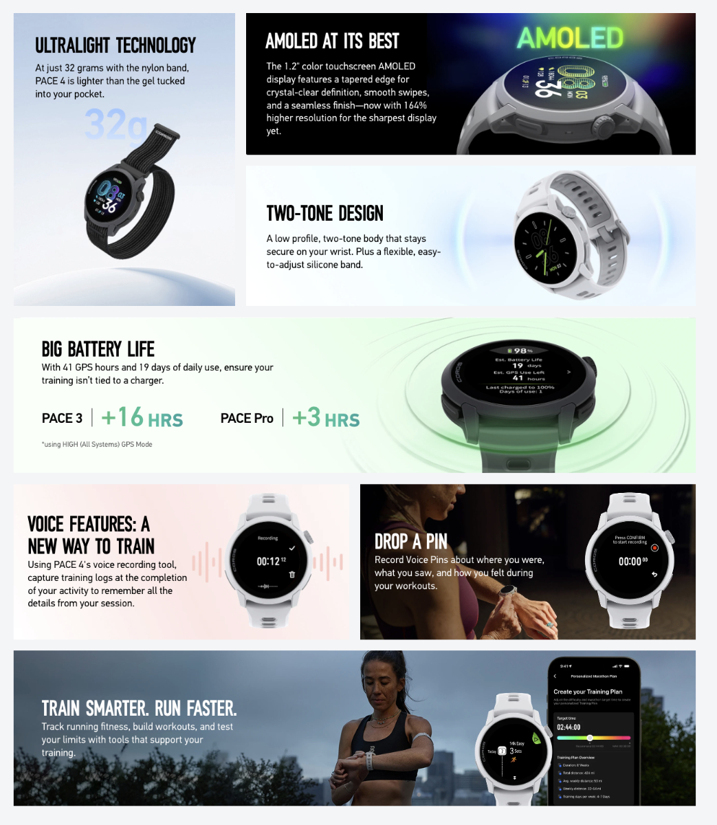 Aan de ene kant heeft Coros een LCD-scherm omgeruild voor een AMOLED-scherm met behoud van een 1,2 inch groot paneel. Niet alleen dat, maar het nieuwe scherm heeft een resolutie van 390 x 390 pixels, in plaats van de 240 x 240 pixels van de Pace 3. Bovendien is de officiële schatting van de batterijlevensduur gestegen van 15 dagen naar 19 dagen bij dagelijks gebruik en slaapregistratie.