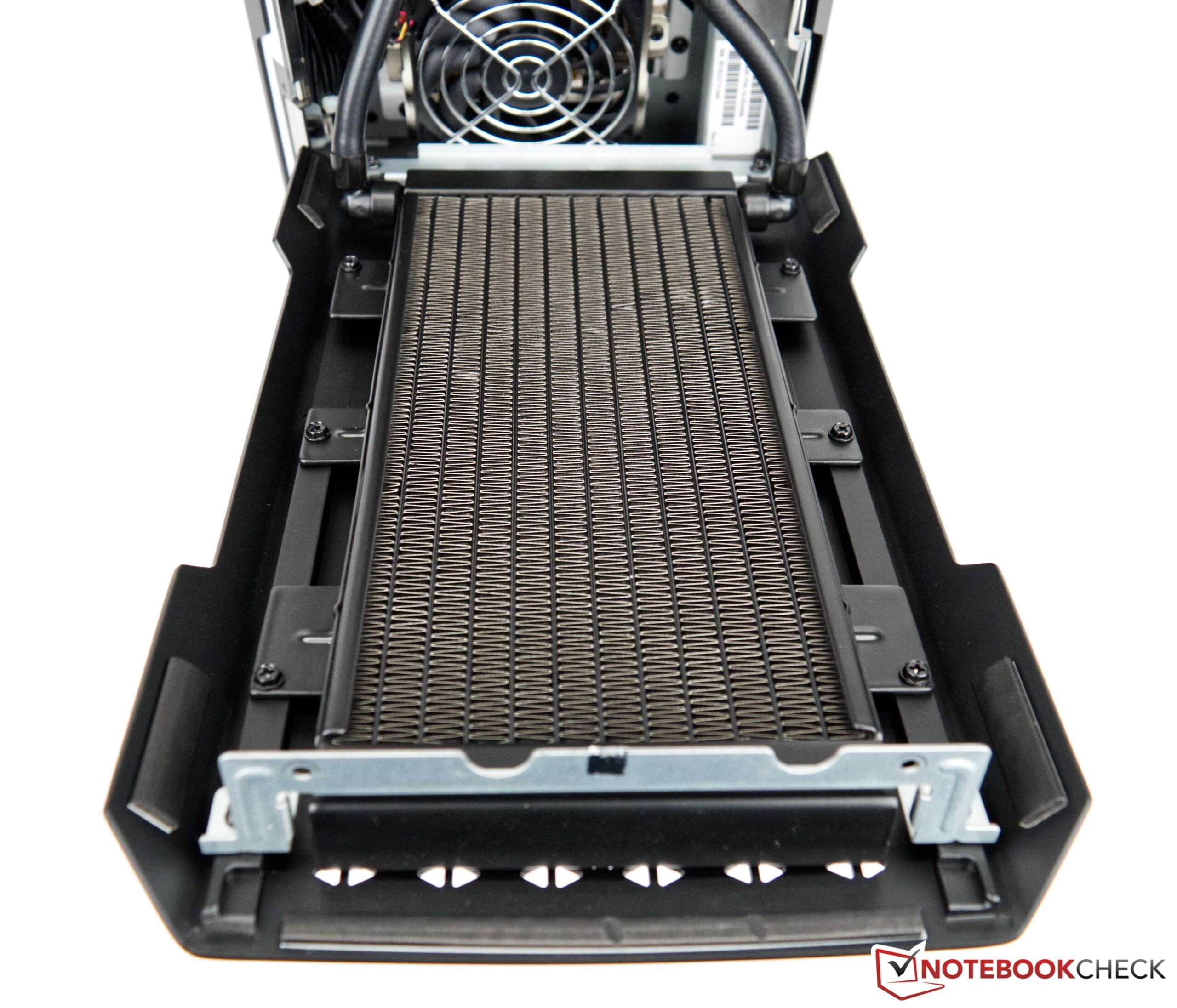 De massieve behuizing biedt een zeer groot oppervlak om de warmteoverdracht mogelijk te maken. Onder belasting warmt dit merkbaar op, en het zogenaamde schoorsteeneffect zorgt ervoor dat de koele lucht vanaf de zijkanten wordt aangezogen en direct langs de koelribben van de twee AiO's wordt geleid om vervolgens door de grote 140-mm ventilator bovenop uit de kast te worden geperst. Voor effectieve koeling van de grafische kaart is deze extra uitgerust met twee kleinere ventilatoren om de transformator en het VRAM te koelen.